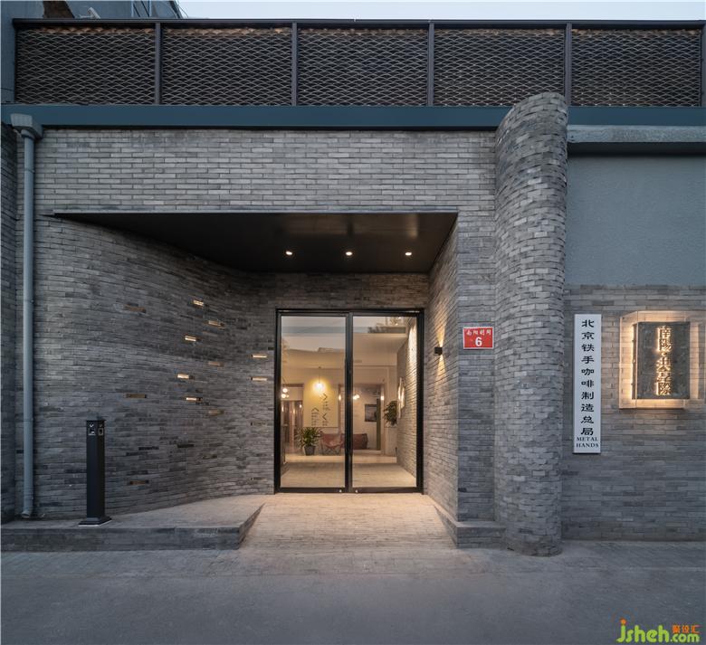 建筑外立面在材质上使用青砖,顺延整个胡同古朴的气质,主入口处采用柔和的弧线处理形式,形成一个具有进深感的入口等候区,同时又兼顾兼顾引导客流的作用。为了更加凸显入口的弧度,我们使用了新材料——玻璃砖,给原本古朴的青石砖添加了几笔通透的色彩,在夜晚能够给昏暗的胡同点起几盏明亮的灯。