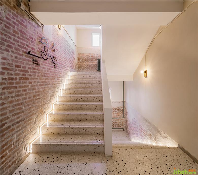 The building has four floors, and the staircase is the most important vertical traffic in the building. The staircase wall half retains the original red brick material, half uses the art paint material, half is history and half is new. The staircase is like a dream space that can travel through time and space. The stair steps continue the original terrazzo floor with embedded acrylic light strips, running through the entire four-story building space, forming an area full of history.
