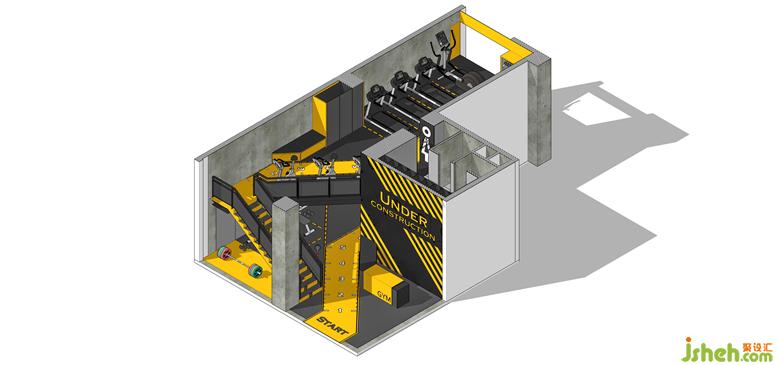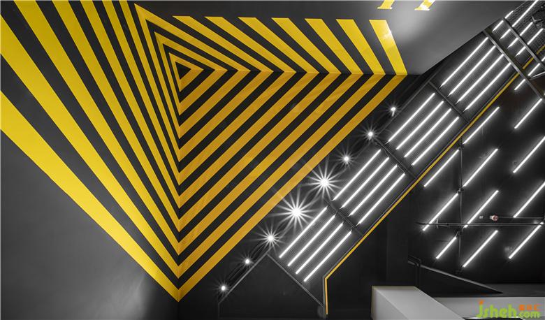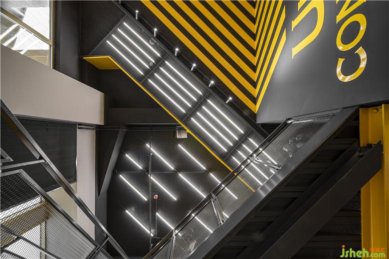 UNDER CONSTRUCTION健身房需要延续其“未完工的施工现场”这一设计风格,不同于以往裸露混凝土、工字钢等结构部件的设计手法,大观建筑在此次健身房的设计中以夸张的“黄色警戒线”来体现施工现场的视觉效果。