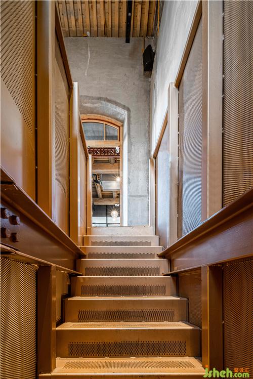 通往二层的楼梯间区域,不仅仅是一个交通空间,用一种既围合又通透的形式,将人们引导进入二层更加开阔的区域。设计采用了简洁的手法、极具工业感的混凝土墙面与现代感的金属板,肌理与光滑、粗犷与精致形成强烈对比,在这个非常小的空间内,材质对比的冲击效果被充分发挥,金色的“漂浮”楼梯和原色的水泥质感形成了强烈的冲击力。咖啡厅装修设计对比不仅能突出新与旧之间的关系,更是能让两种材料之间产生对话,从而让空间中的人与空间进行对话,产生思想与共鸣。