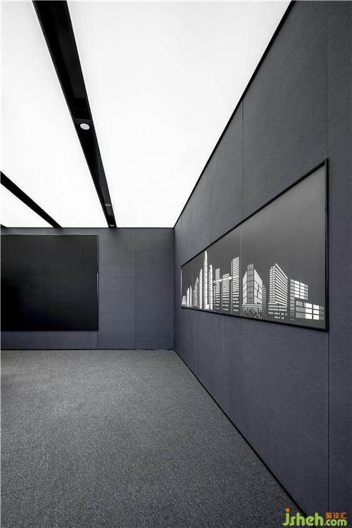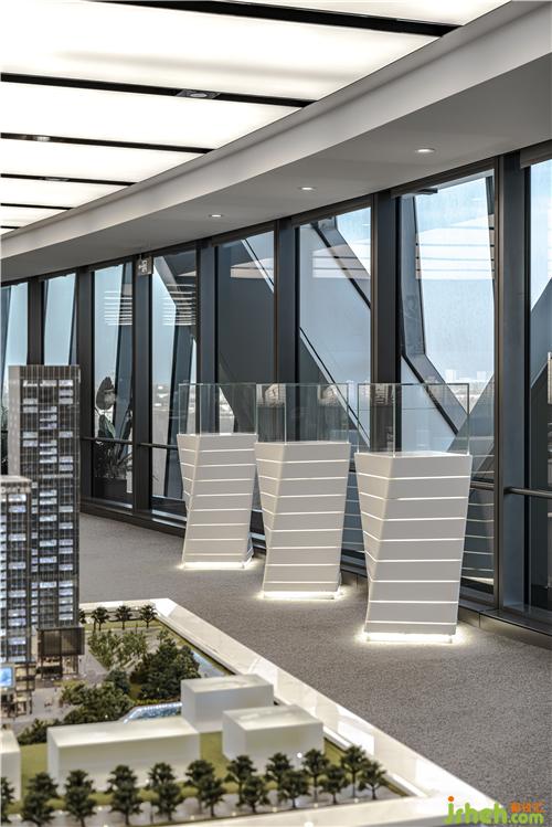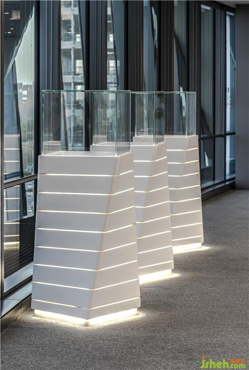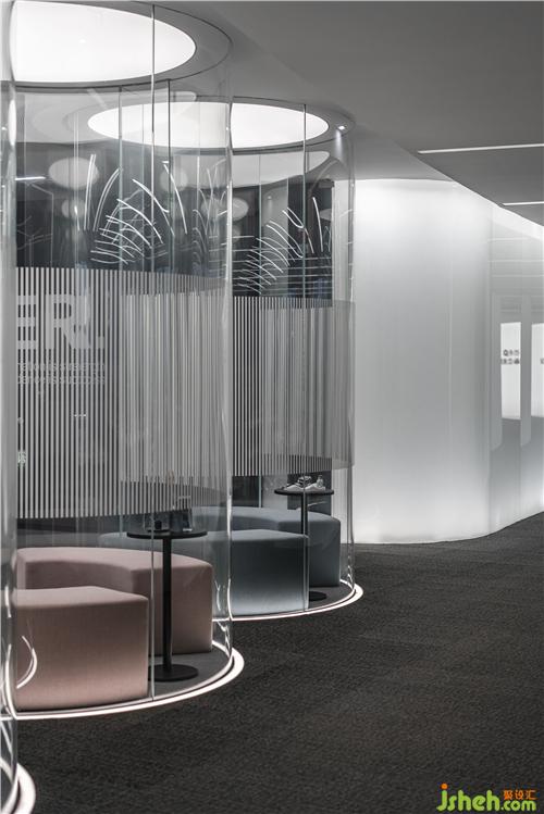 通过不同形式的光构成的展示区域,我们下一站就来到了这个似乎可以将“光”具像化的空间。在这里,设计了五个通透的圆柱形玻璃体,北京办公室设计顶部配以发光灯膜,让光线均匀的洒在每一个玻璃体内,形成一种通透的光感。人们在这五个空间中,可以近距离的触摸光,感受光。