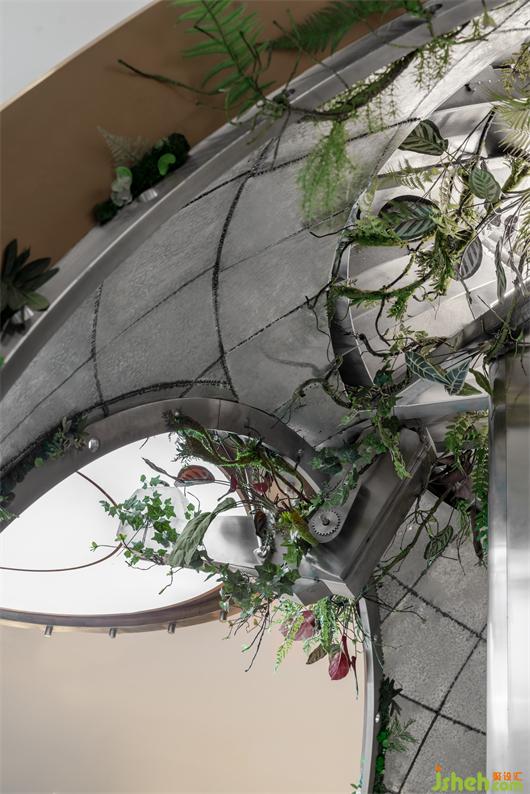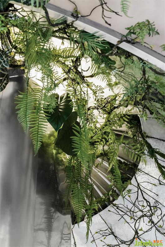“悬浮”在半空中的长桌源自于切开的树干,而镜面材质的截面完美的倒映出了窗外高楼林立的世界。举起咖啡杯,从桌面看到外面的世界的倒影,纷纷扰扰仿佛离着万年之远。