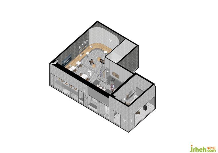 外立面整体材料以采用灰色肌理感强烈的肌理漆为主材,COFFEE设计室内外紧密结合的设计原则,采用框景的设计手法每一个窗洞都是一副神秘的画。正对吧台的立面设计了两个半弧形墙面一个对内为展示,一个对外为卡座,通过半弧形墙面对空间进行划分虚实结合。