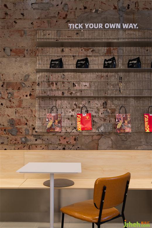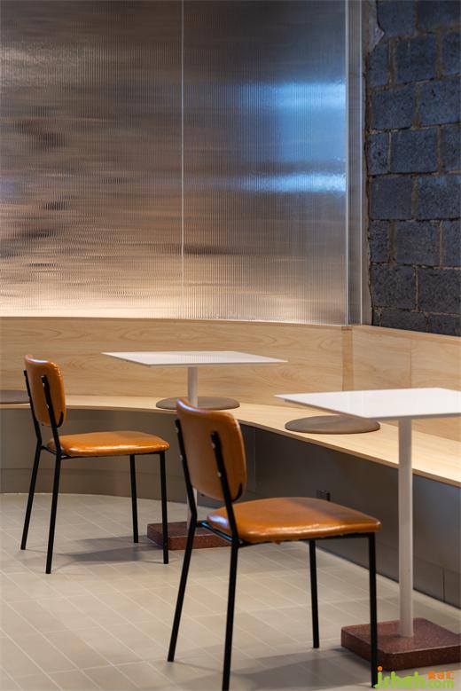 l 室内客座区设计保留原生条件基础。COFFEE设计客座区背景墙采用半透明亚克力材质围合出弧形,Ticle coffee标识与原生墙面肌理若隐若现,好似野外迷雾重重透出的点点亮光,使人不知觉的想要走进窥探。