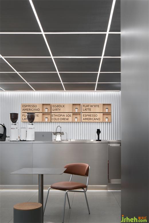 本店位于沈阳长峰大厦,空间设计上依旧秉承着超现实概念,设计主题为“时空之门”。COFFEE设计结合场所开敞的入口展示面,通过光线设计汇聚于吧台,进入其中好似时空隧道入口,整体设计以原色不锈钢金属、波浪板、线性灯带强调简洁、纯粹、明亮的空间氛围凸显品牌符号。,