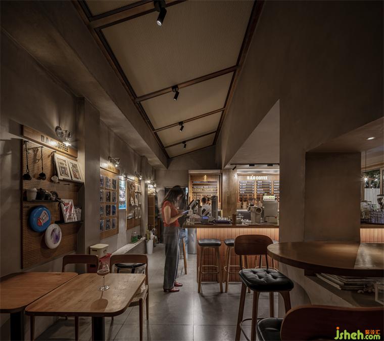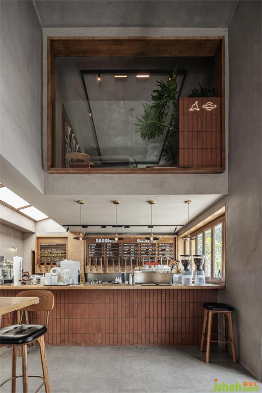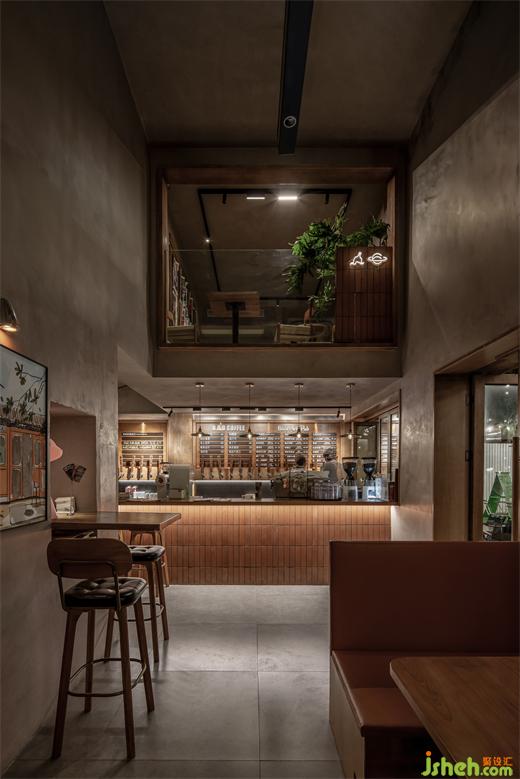 咖啡厅设计希望空间有更多的视觉穿透视角,五米的挑高空间其四分之一,玻璃以内空间,在吧台上方成为了上帝视角般的舞台中心(散座区),身居高位的顾客可以清晰的看见下方穿梭的人群,见证一墙双方的关系建立。另一四分之一私密的场所无法被纷乱打扰,形成独立空间。