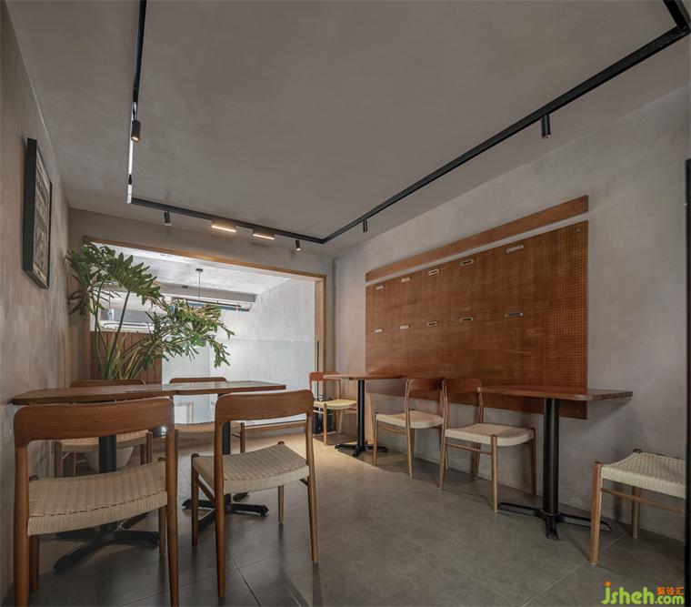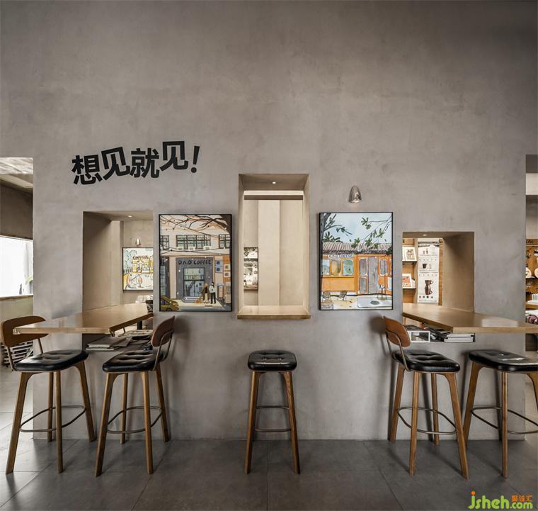 顾客可以自由选择,如果希望被打扰就坐在有窗洞区域,不希望被打扰便避开窗洞即可。窗洞的设计改变了原本狭长的压抑氛围,打通了两个“盒子”坚不可摧的隔阂,增加了人与空间,人与人之间的互动性。以空间为工具,通过打破一墙之隔建立人与人间的信任,同时还能保证空间和通风通透。