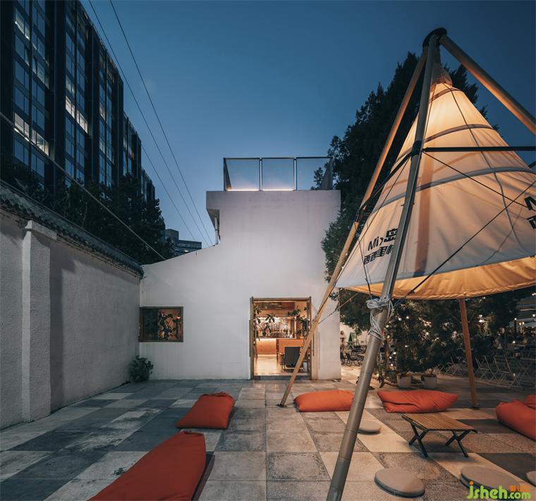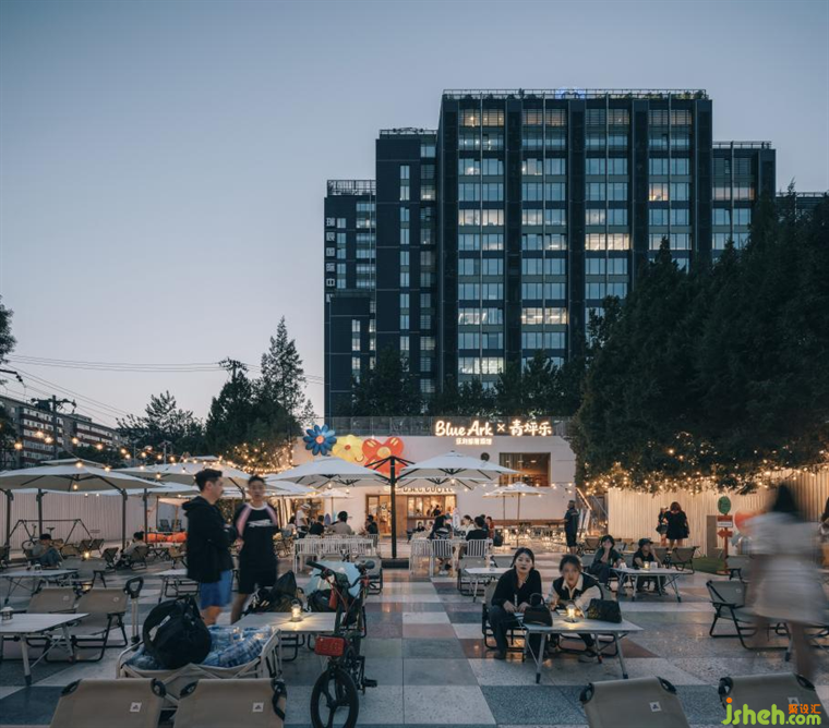 ▼温暖的色调和柔和的灯光营造夜幕下户外席地而坐的场地,Warm tones and soft lighting create an outdoor seating area at night