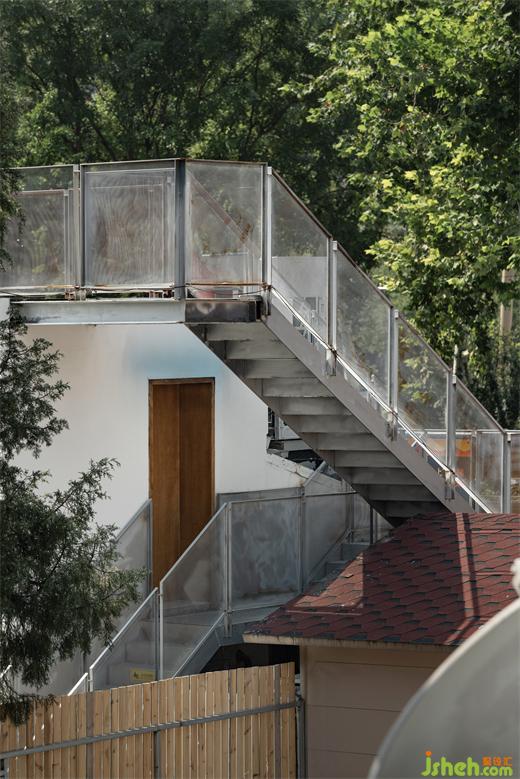 ▼由铁制楼梯通向楼顶露台,An iron staircase leads to the rooftop terrace