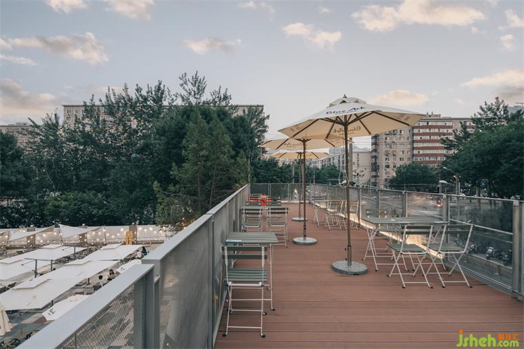 在露台上可眺望不同的城市光景,露台提供了一种可供不同时令季节下多样的经营性活动空间之用。从露台往下的大面积户外餐饮酒吧场地,作为街道的功能补充,为街区提供共享交流的友好场所,以及聚集休闲公共平台;作为酒吧的外部延伸,创造酒吧的活力。