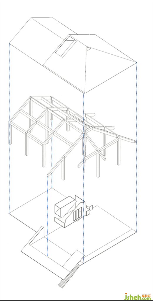原来是大斜坡的屋顶,如果按照原来的形状效果,屋顶势必被平面化,也不能与内部空间有机结合,我们以退为进在屋顶向外挑出一个白色盒子,尖形的屋顶体量被削去了一角,是二楼夹层向外的延伸,延长了内部空间的长度,酒吧餐厅设计打破沉闷厚重的尖形屋顶。麻雀虽小五脏俱全,小盒子的内部是私密包厢空间,围绕盒子构造布置家具,向酒馆内侧开长条格栅窗,站在小型阶梯可以顶部眺望远方。
