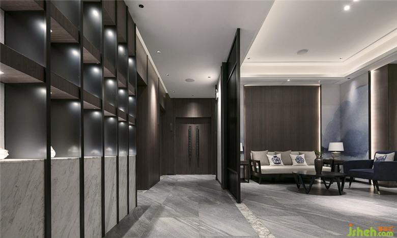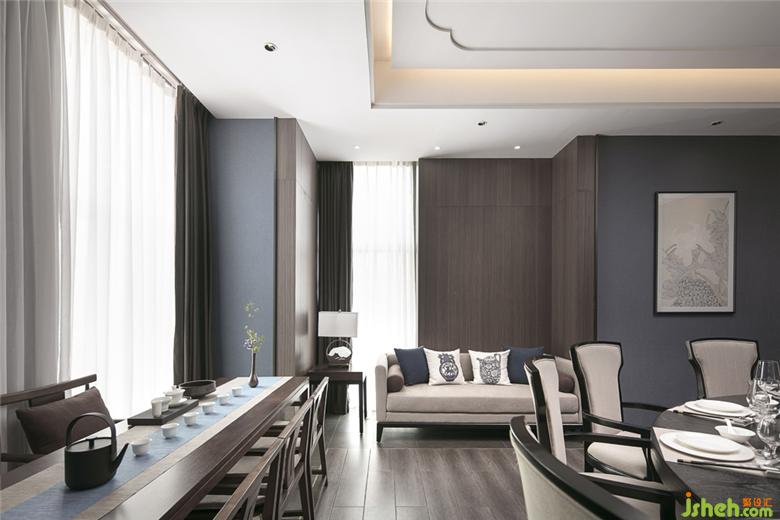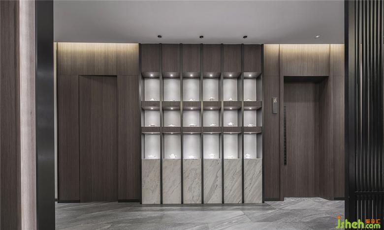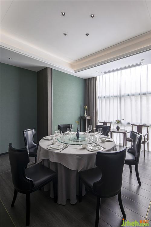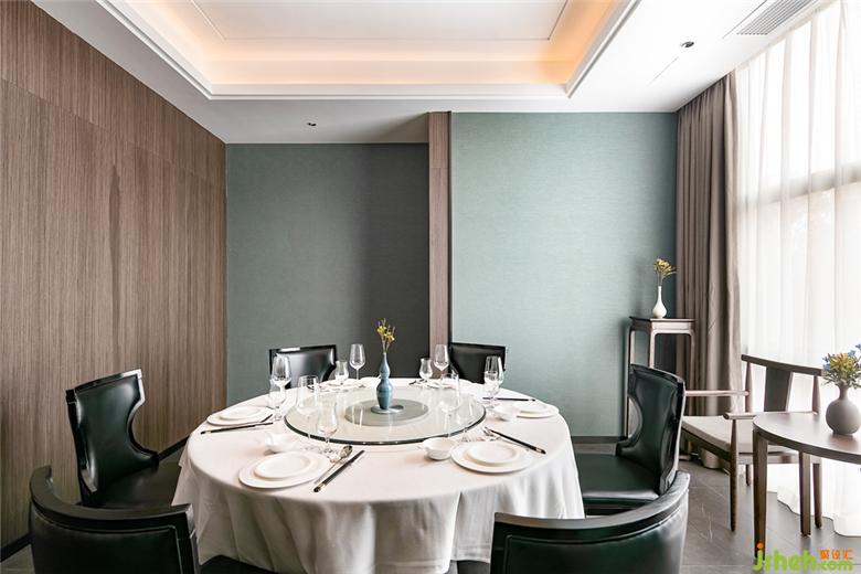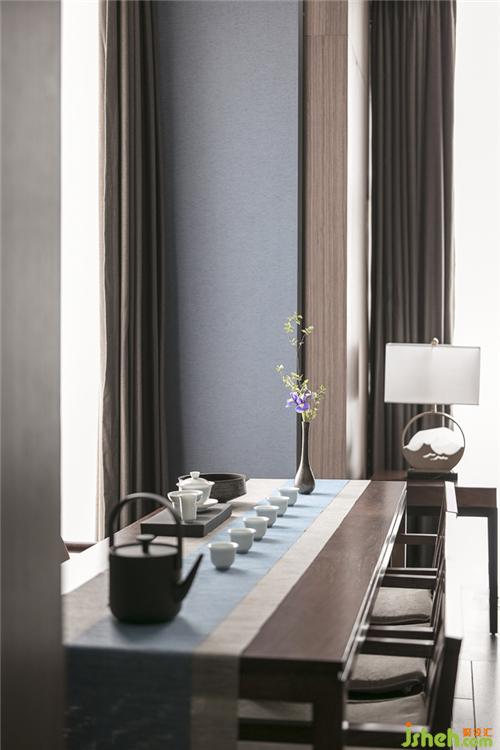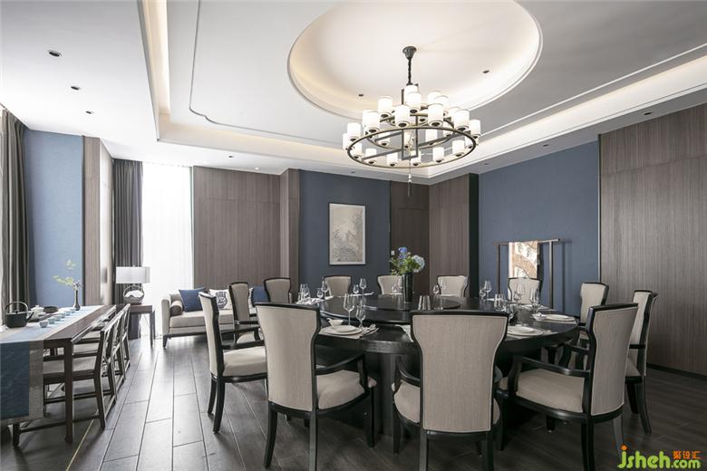 本案运用蘑菇石的墙面背景,粗犷有力量。KD的胡桃木饰面板,温润而稳重。地面覆盖了兼具防滑功能与自然肌理的岩石质感地砖。空间配色为胡桃木色、蓝色、和卡其色系。蓝色是带有忧郁、天真、冷静同时具有皇室的高级感和威严感的颜色。空间采用胡桃木色木饰面,搭配饱和度低的牛仔蓝,营造静谧稳重的就餐氛围。茶台和桌面的花依据时令进行变换,冬天的雪柳腊梅,春天的芍药牡丹,夏天的藕荷,秋天的红枫。餐桌上的菜品也是四时不同。记四时茶食,赏四时美景。除了石材木材这些天然的材质以外,还运用了现代装饰中常用的砂黑哑光不锈钢进行收口。为了缓解直线条带给人的刚硬刻板的感受,所有主题墙面均采用山水题材的墙画。与空间相匹配的气场,灵动的曲线和深浅变化的蓝色,同时提升了空间的延展性和动态美。将空间比喻成人的话,骨架和灵魂是坚韧的,身段是柔软的。刚与柔,阳与阴的融合。餐厅设计