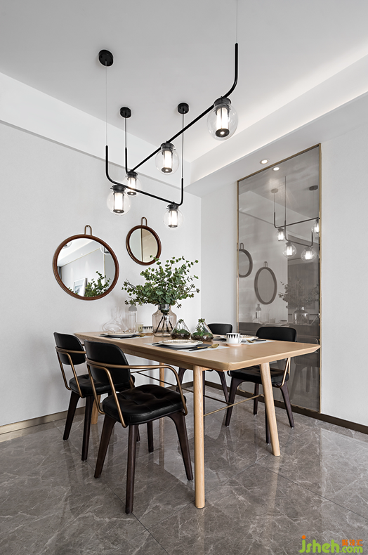 客餐厅以米白色系为基调,大面积米白色系与原木色家具的搭配营造出清新自然的空间氛围。EricTai黑白原创挂画与艺术雕塑点缀空间,使原本平实的空间增添了趣味性和艺术范。