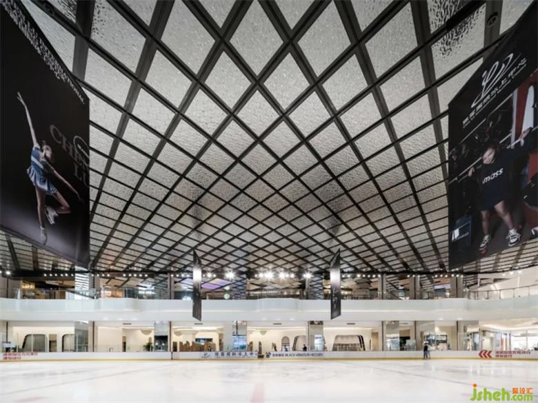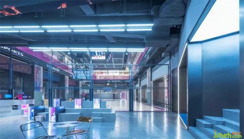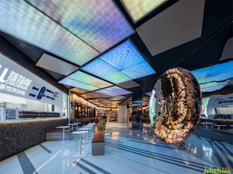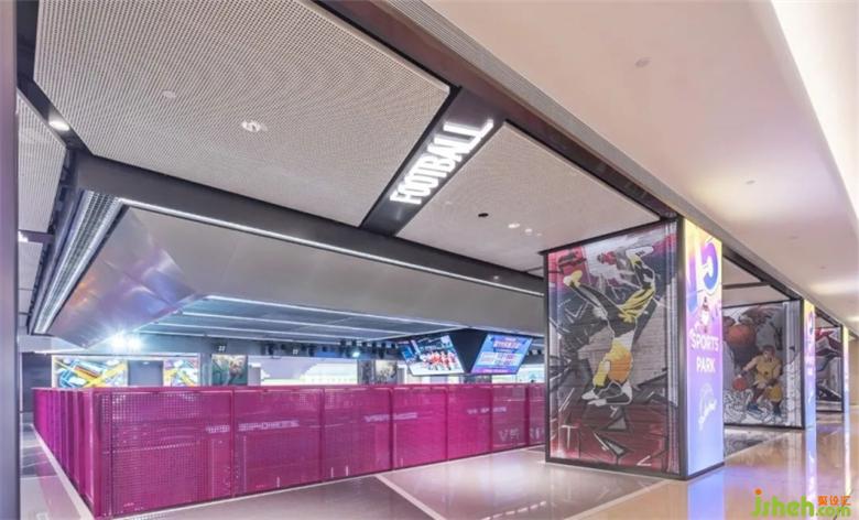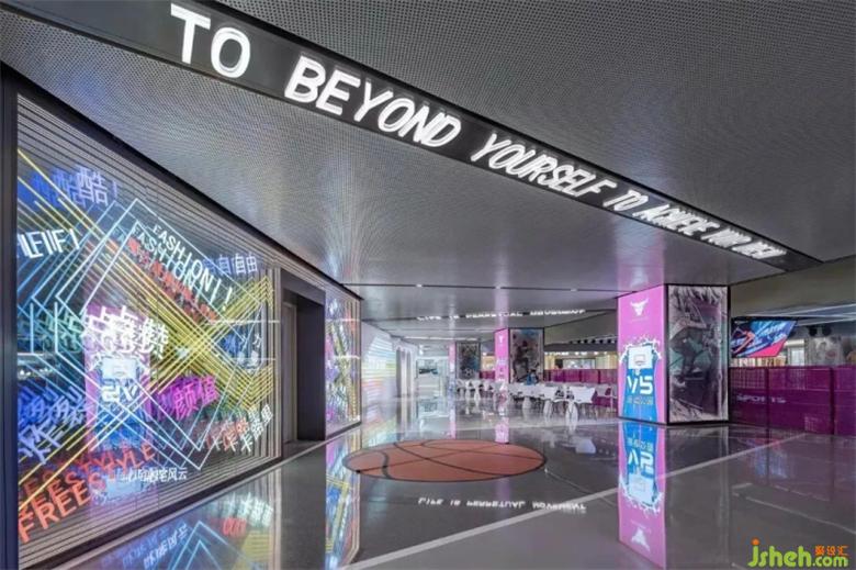 运用高饱和度的炫彩霓虹线性灯光,构建娱乐性标语昭示面,形成强烈视觉焦点汇聚;商场设计天面嵌入金属黑白撞色字母LED灯带,与地面篮球、跑道等运动风格贴画,打造时尚运动风格。