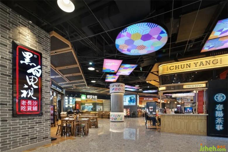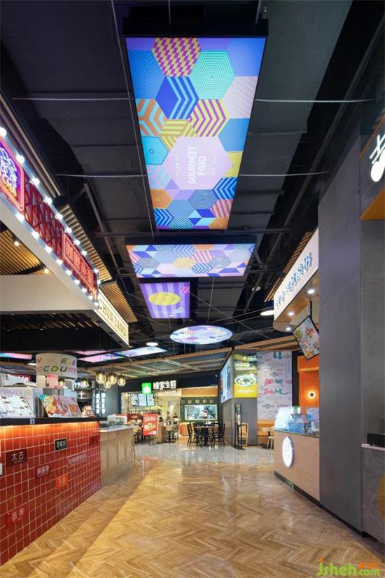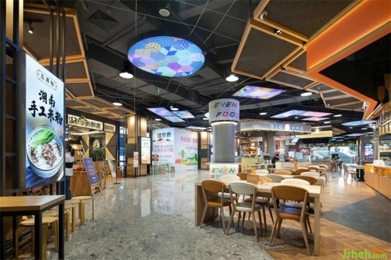 入口处由很多个不同颜色的高尔夫球组成的标志性的大台灯,散发出温暖的光,美食广场设计将大家带入轻松愉悦的空间,从而开始美食之旅。