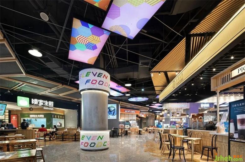 内部原有的外露柱结构,美食广场设计通过多色的高尔夫球组合,巧妙的变身为小吧台补充功能需求,由彩色小球组成的eleven food增添空间细节和趣味性的同时又增加一层新感官,新体验。
