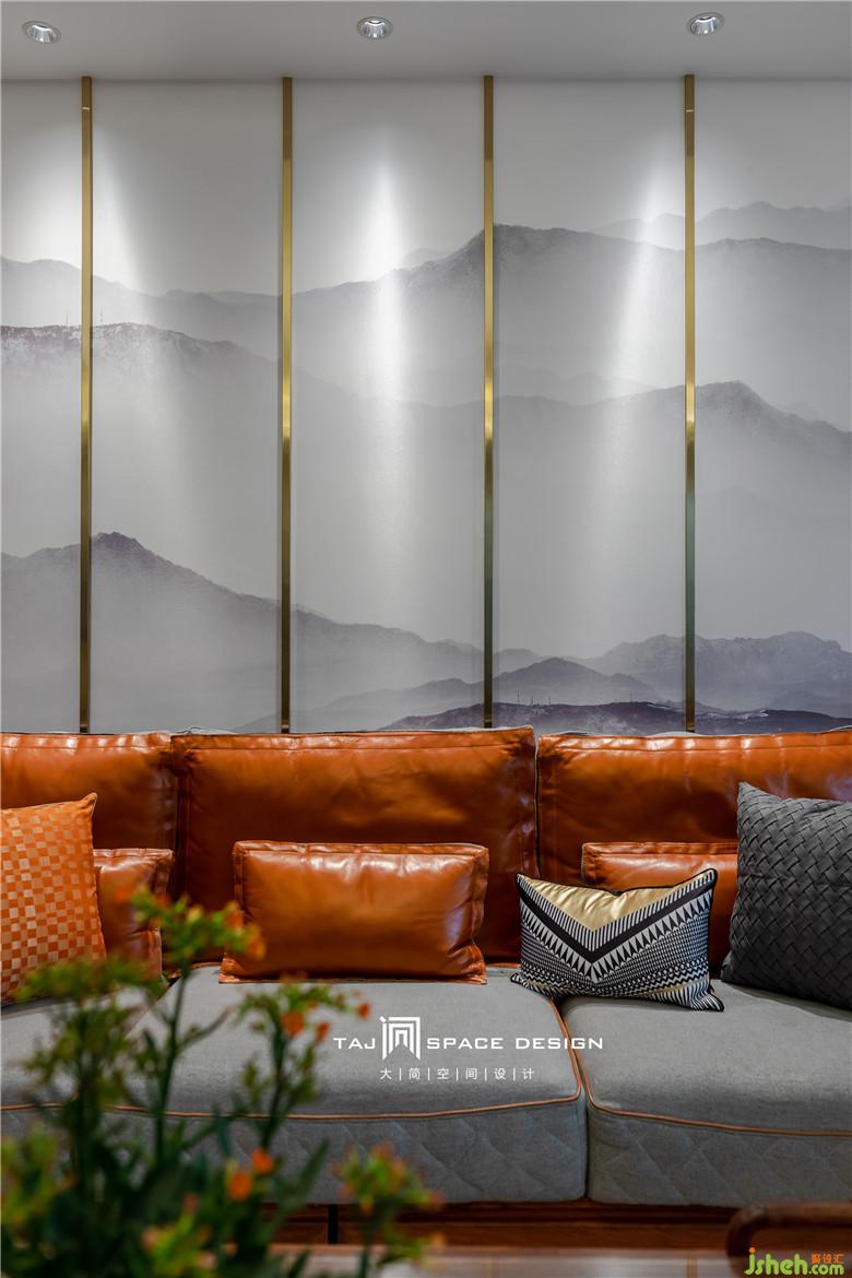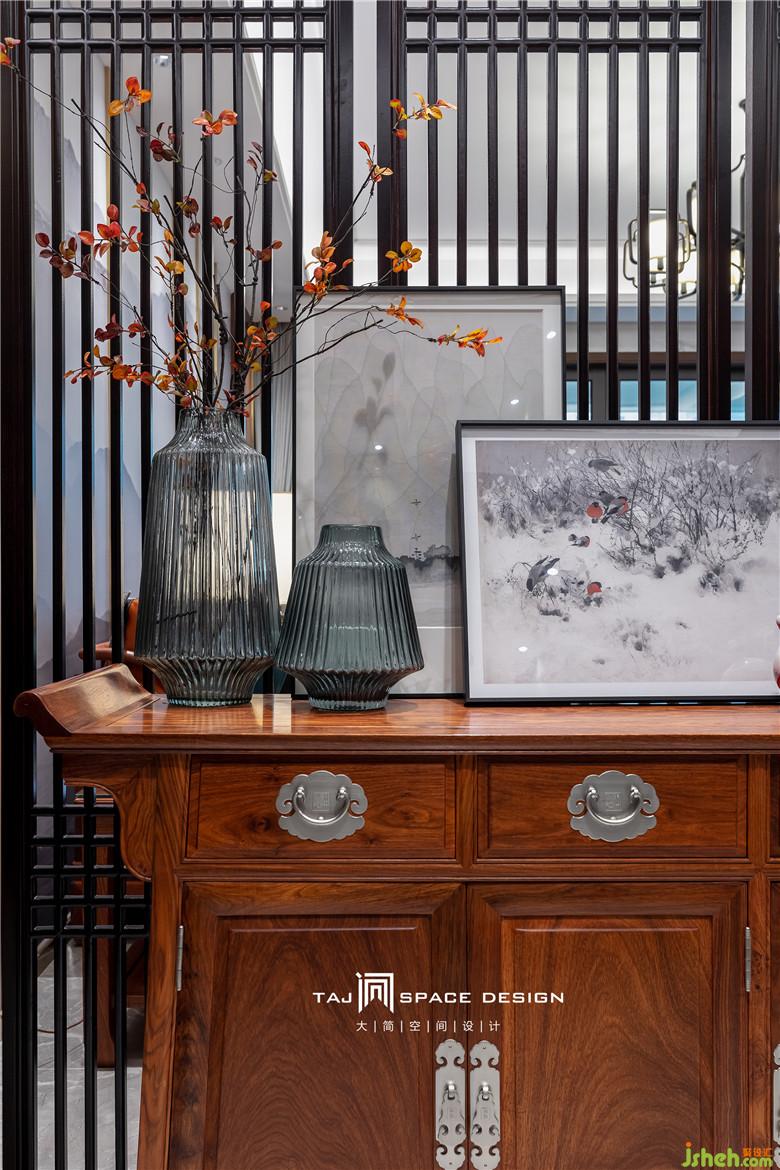 玄关放置古典韵味半通透的格栅屏风,室内设计师制造出“移步换景”的效果。通过空间的梳理,针对客厅运用对称和简练的线面构成手法,确立出空间的中轴线,并且在立面处理上,力求在疏密比例的线面衔接中,做到延伸的细节追求。