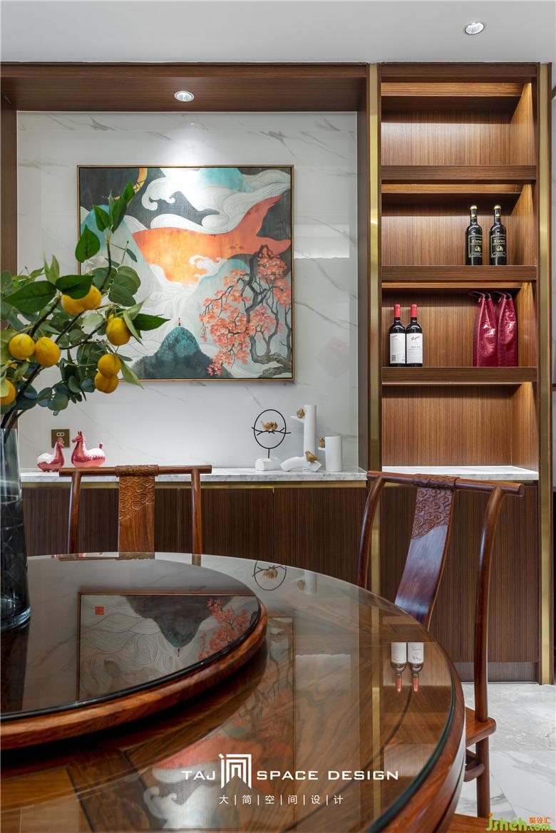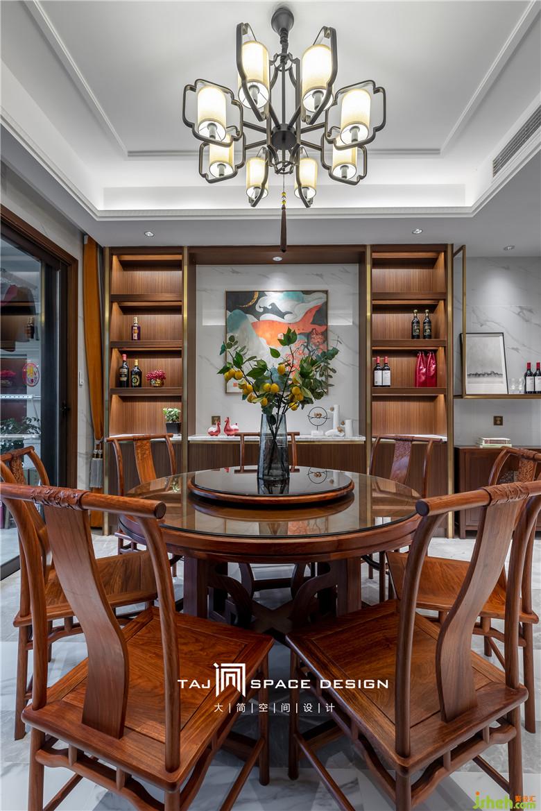 有“味道”的新中式餐厅,以当代手法演绎,注重实用的实用性,并将人文情怀注入平常生活。餐厅的空间室内设计师以圆桌为中心将周遭辐射成一个圆形环绕动线,使得餐厅更加富有创意而不呆板,厚重实木的餐桌则体现了中式的大气沉稳,与客厅的意境相得益彰。