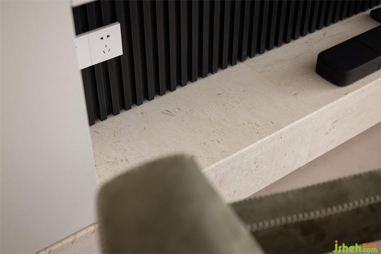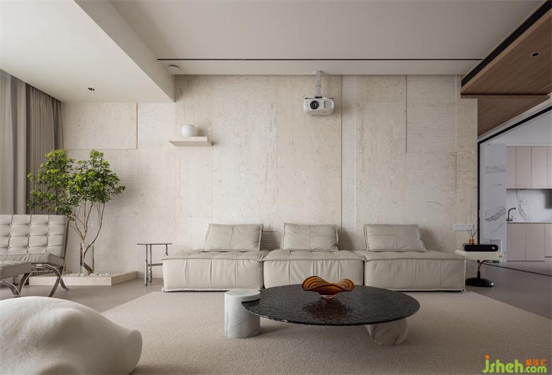 不规则的洞石背景是客厅的一大亮点,展现天然材质的本质美,与米白色的艺术墙漆相辅相成,澄净而温柔,淡化都市与自然的界限。