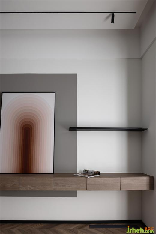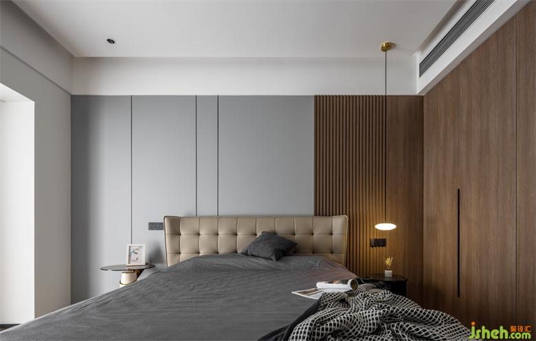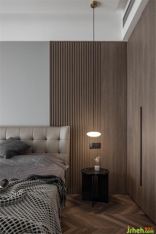 主卧内敛灰色和胡桃木在规整中相互映衬静谧的空间节奏加上艺术化的展示,设计师试图通过纯粹的视觉感官