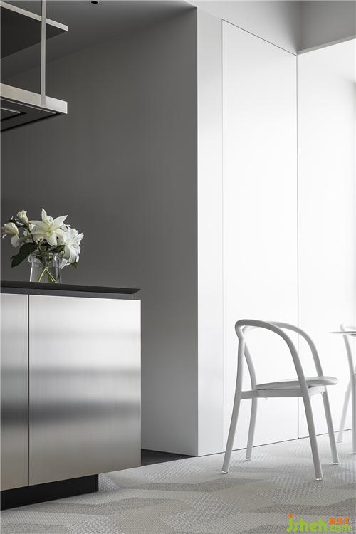 空间以经典的黑白灰系作为主题配色,通过平衡三者之间的比例与面积,配合皮革、金属和镜面材质的间奏,细细打磨出家的质感。