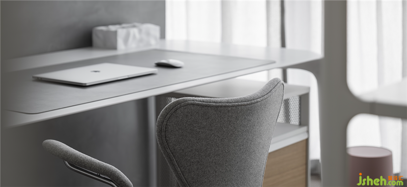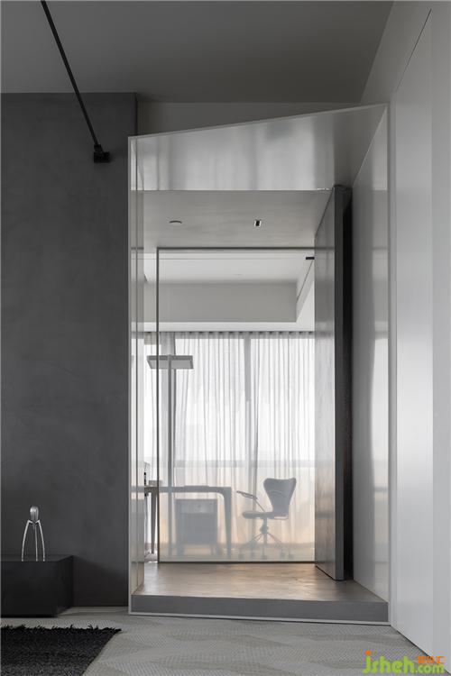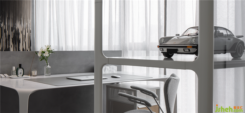 迈步进入卧室,一侧为家庭办公区,在Pandomo和石材铺就的浅灰底色中,金属、镜面及皮革等材质交织碰撞,带来平衡的美感。