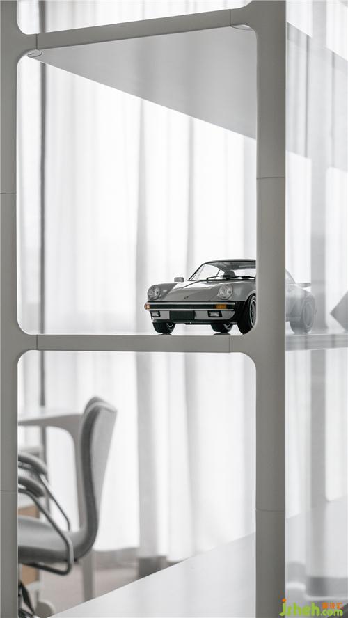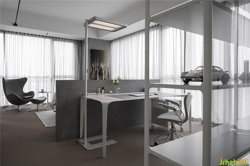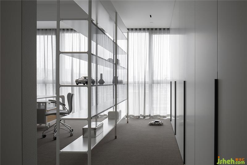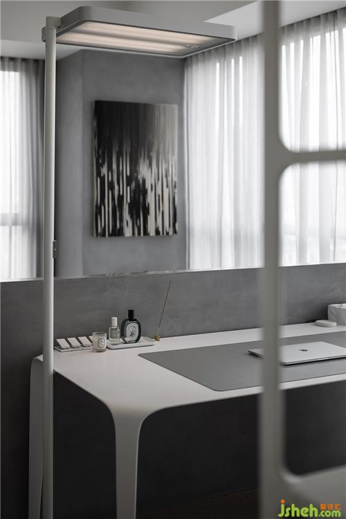 白色镂空置物架保持空间通透感的同时,也代表了屋主年轻未满的人生状态。置物架与书桌围合出办公场所,也与衣柜自然分隔,起到了划分功能区的作用。