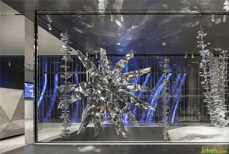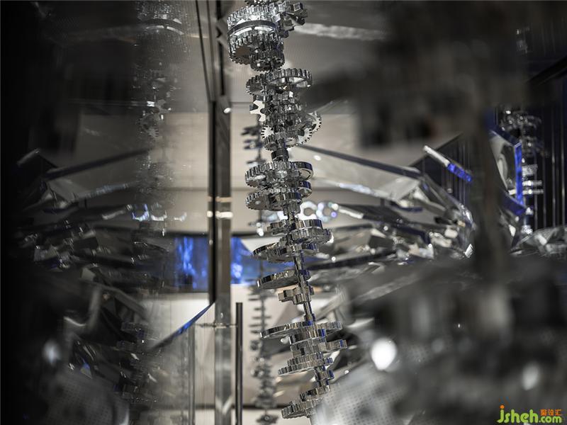 钢材的反射强调装置的轻盈与灵透,截然不同的材质与感受碰撞出矛盾质感,弥合出整体空间的框架与戏剧性。