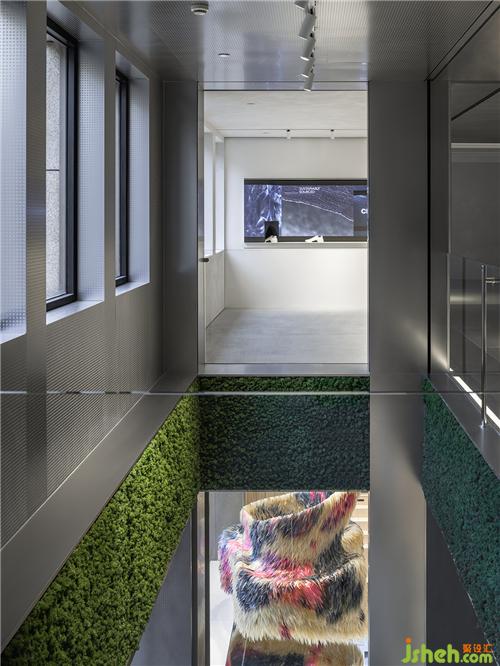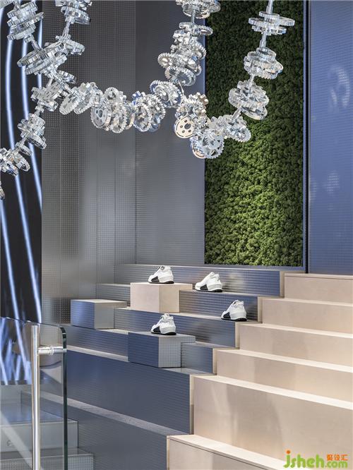 对比传统的零售空间,党明希望通过自由的动线、交互的形式,给予消费者更近距离的开放体验。展示屏通过下方端口达到交互效果,上海店铺装修设计线上的鞋履试穿效果展示,用高科技简化了选择的繁琐,增添互动趣味。