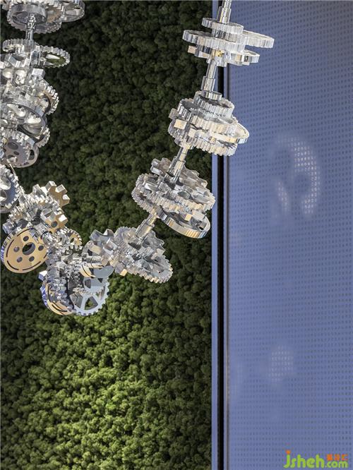 金属与绿植在室内自由地反射光线,大小不一的齿轮跳跃在空中,仿若琴弦上碎裂的音符,以柔和的方式展现科技与工业的氛围。