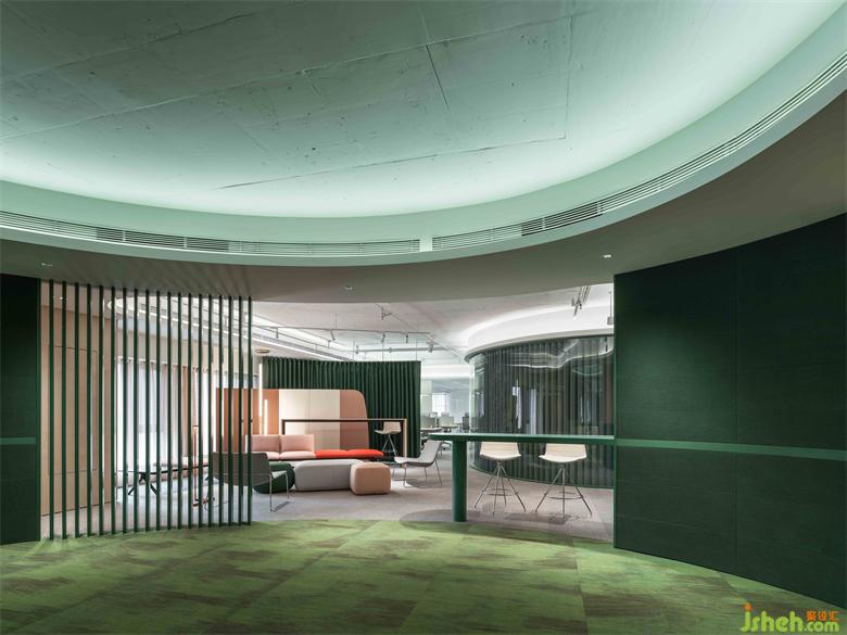 弧线造型使空间柔和圆润,通过对空间的重塑,给予虫子破茧成蝶的蜕变感与惊艳感,又如同张开环抱的臂弯,赋予了空间温柔的归属感。