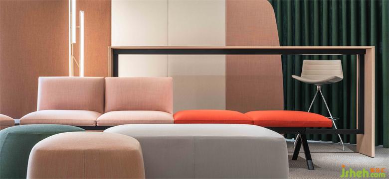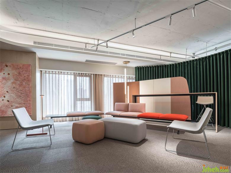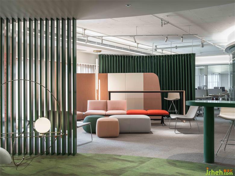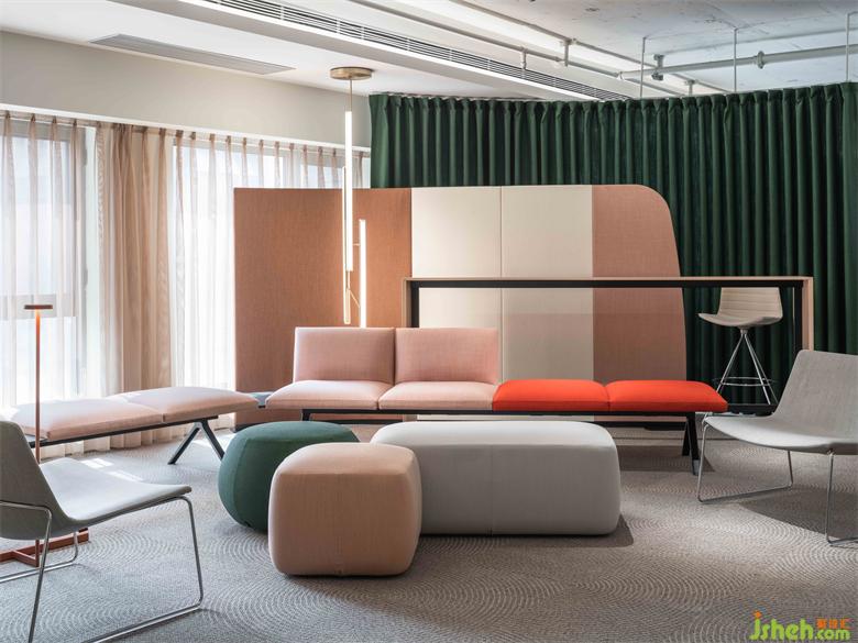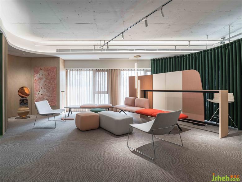 办公室设计师受到石头、水、砾石形态的启发,选取具有流动线条、自然块面感的陈设,使接待区透露出具有亲和力的勃勃生机。