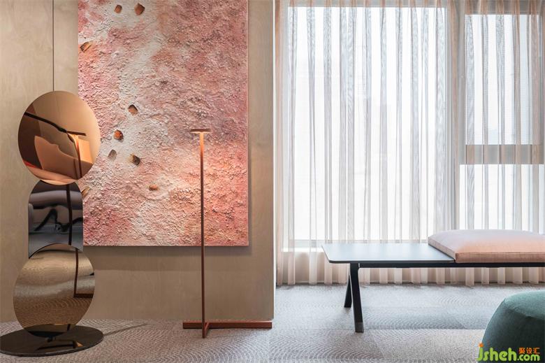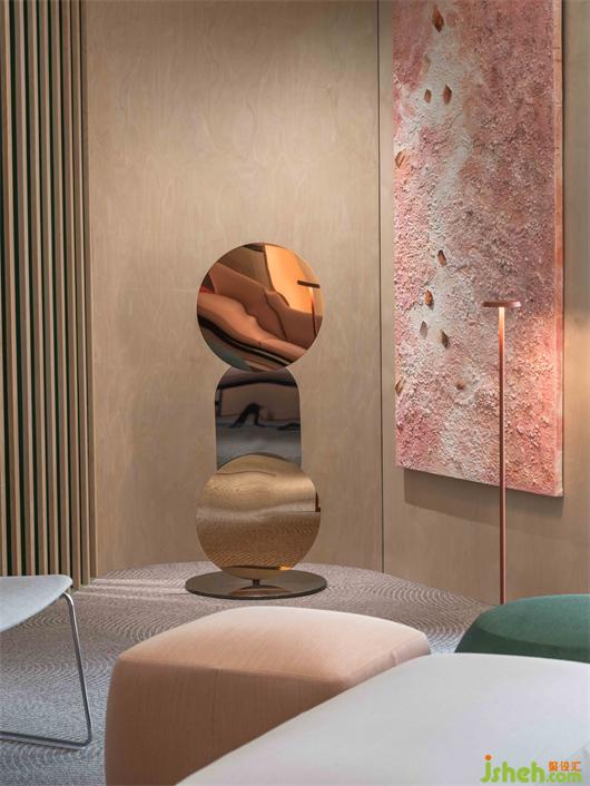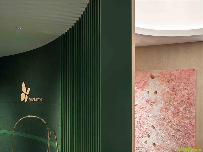 空间中肆意挥洒的绿色、粗砺质感的墙面天花、地毯上像涟漪又如年轮的纹样,大地艺术的精髓展现其间。