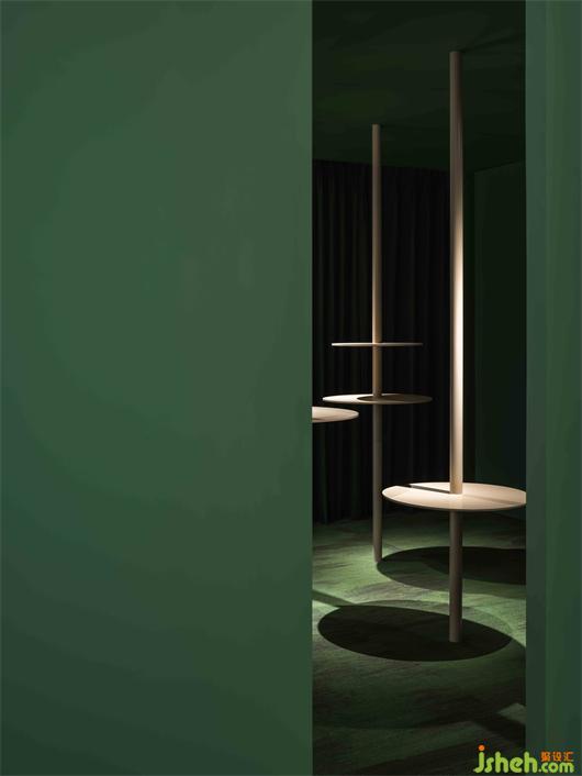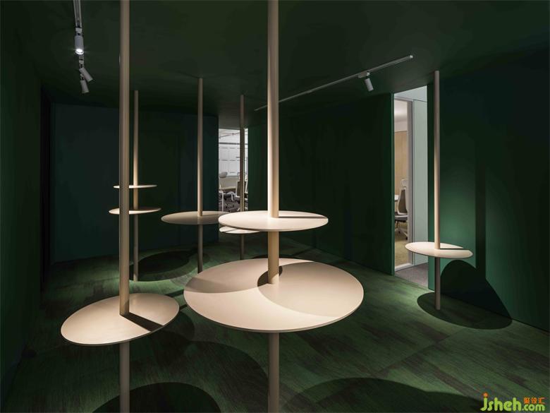 一个个圆形原木展台好像一株株树,树上结满了创意果实。到访这片森林的人,在大面积绿色抚慰下,可以松弛舒缓紧张的神经。