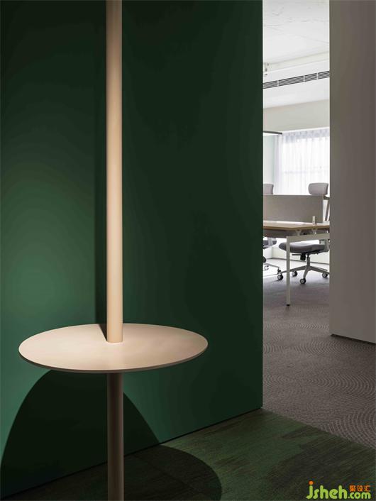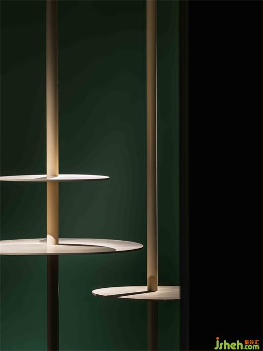 走廊上的灰色地毯像森林中的水洼,雨滴轻落,泛起阵阵涟漪。水面又映着树,圆形呼应交织,弥漫出一片冥想般的氛围。