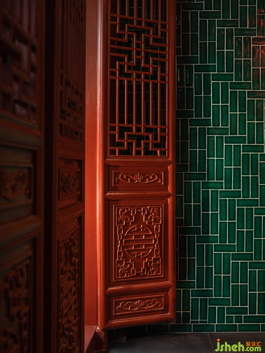 火锅店设计以中式的装修艺术风格为主的墨绿的瓷砖与窗牖的格纹,表达了对传统文化、复杂工艺的迷恋,和工业时代的简炼。