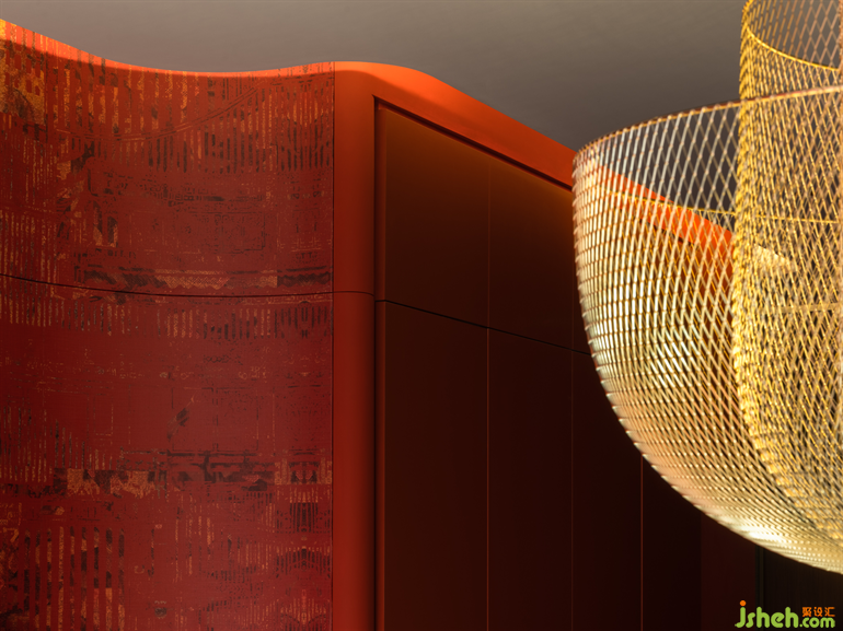 与弧形墙面相呼应着的金色网格的吊灯,成为了空间视觉的焦点。火锅店设计师将一种最基础的材料——黄铜,转变为一种工业诗意的美学。他摒弃了黄铜的笨重、陈旧和刚强,展现出它轻盈、柔韧和古典的一面,以此与纱帐相呼应,空间透过它的纹理和无数细密的网格交织、灵动起来。