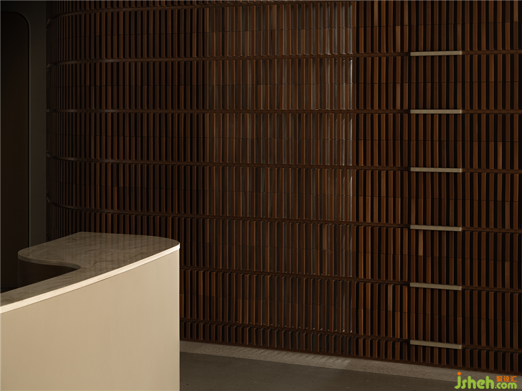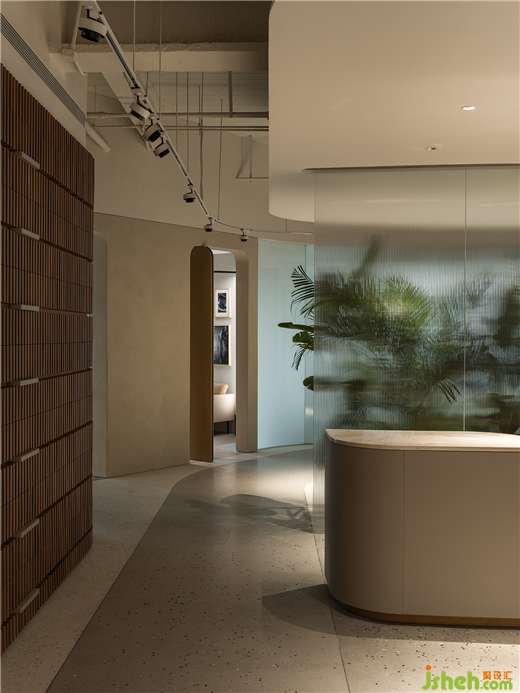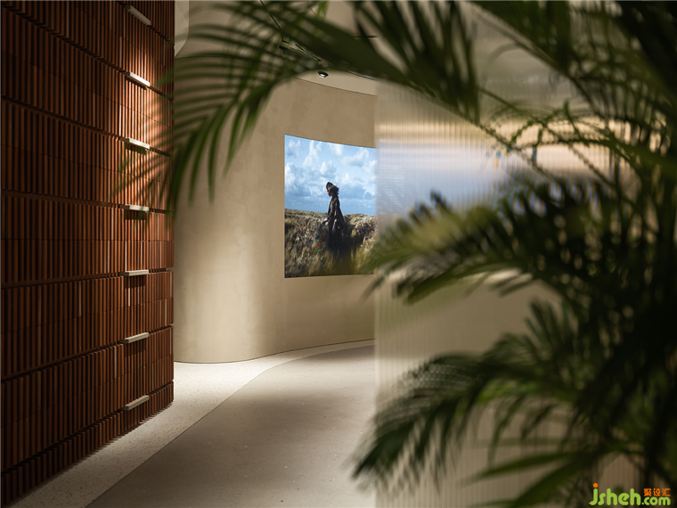 从电梯出来,迎面而来的就是ECCO的前台,ECCO Forest以长虹玻璃和远处繁茂的绿色植物相结合,创造出一种热带雨林的氛围。辅以ECCO精神内含的「皮革创新」的接待台是由高品质的皮革材料制成,为空间增添了额外的优雅氛围。