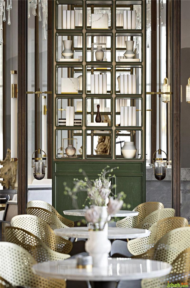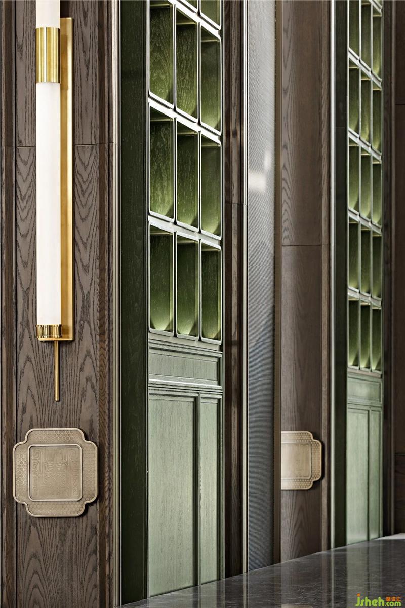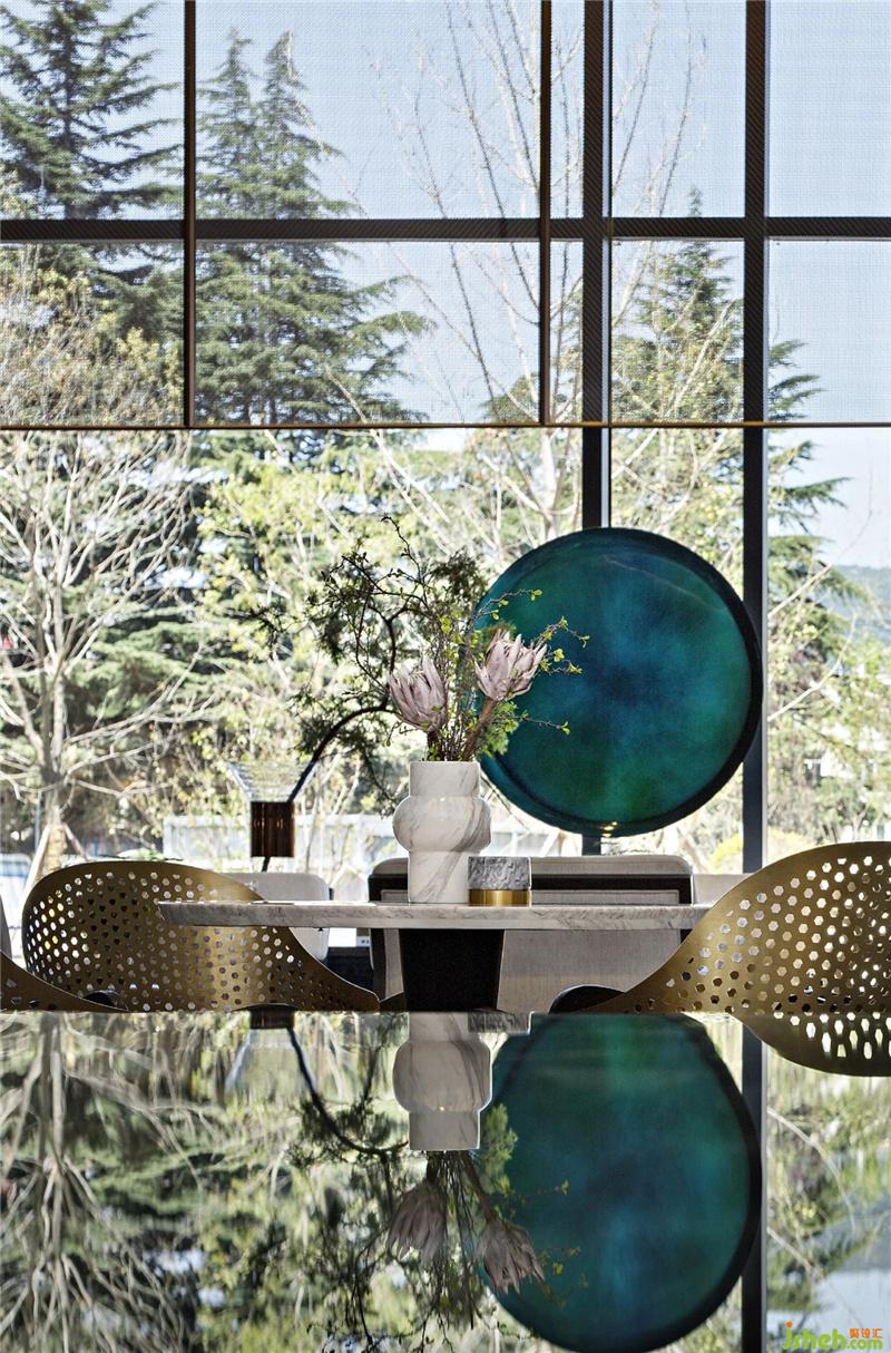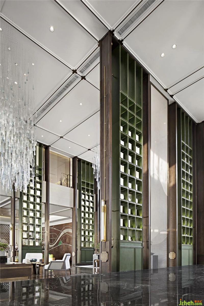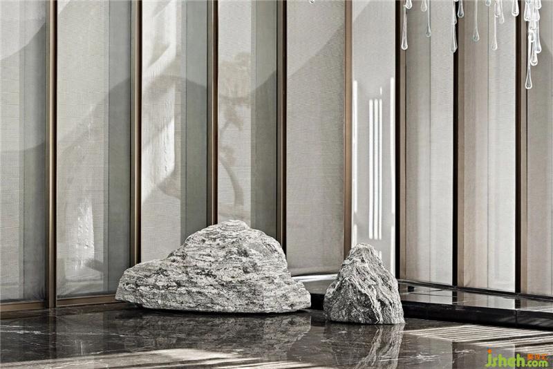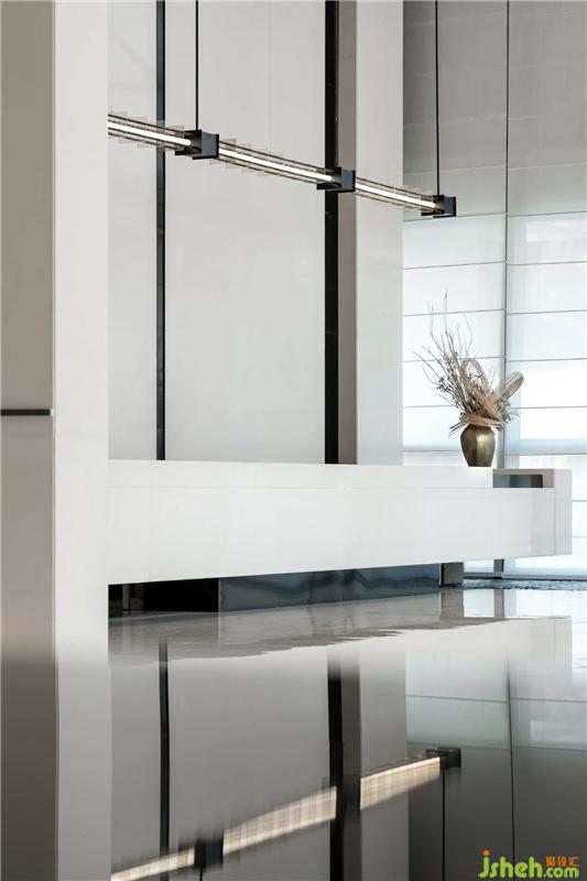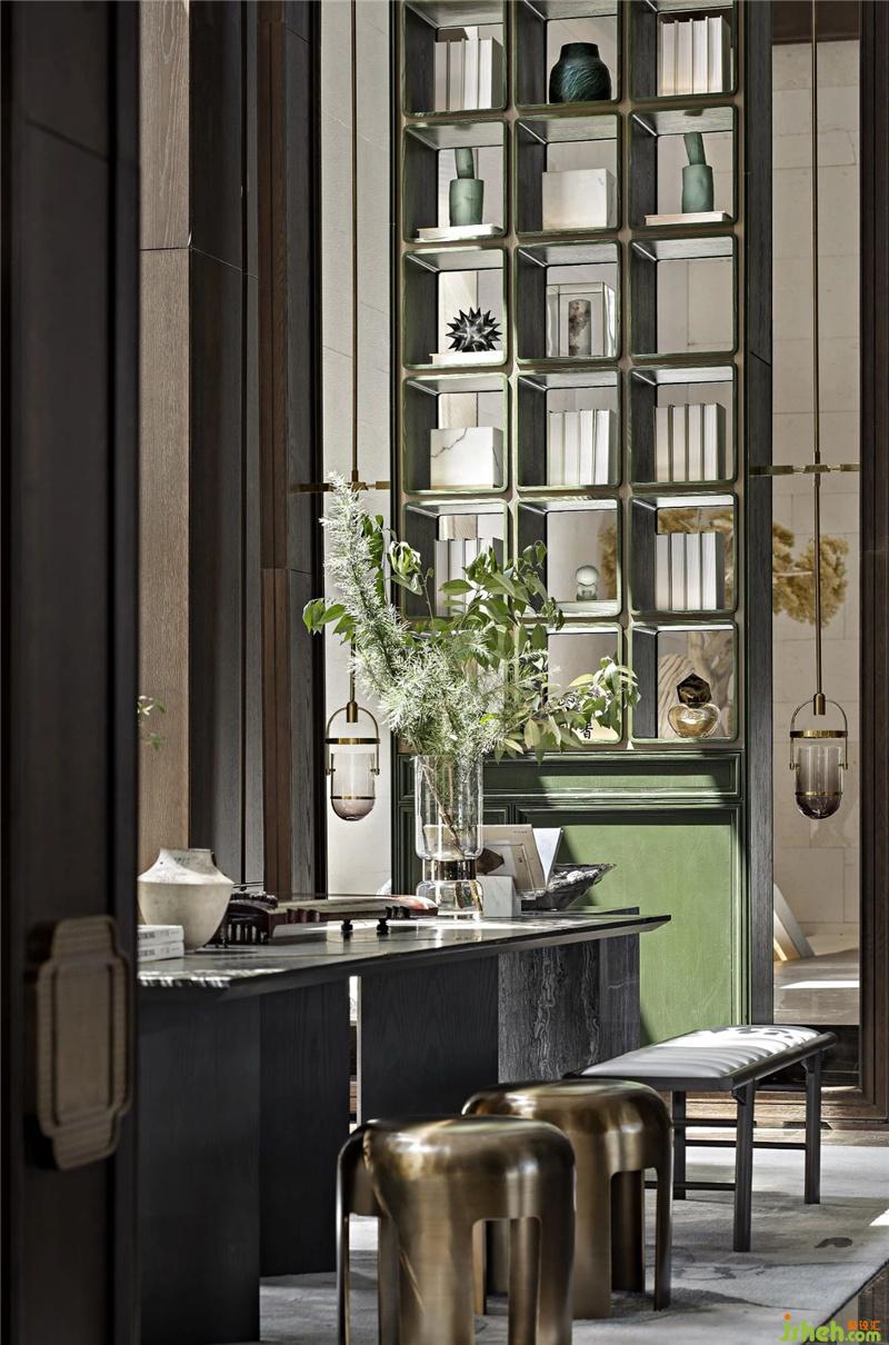 前厅对称式格局,凸显和谐之美。不规则冰棱柱吊灯,将流水凝聚于此,祖母绿通柜好似巍峨的山峰,静静伫立。在空间中山水纵横交错,犹如走进画卷之中。