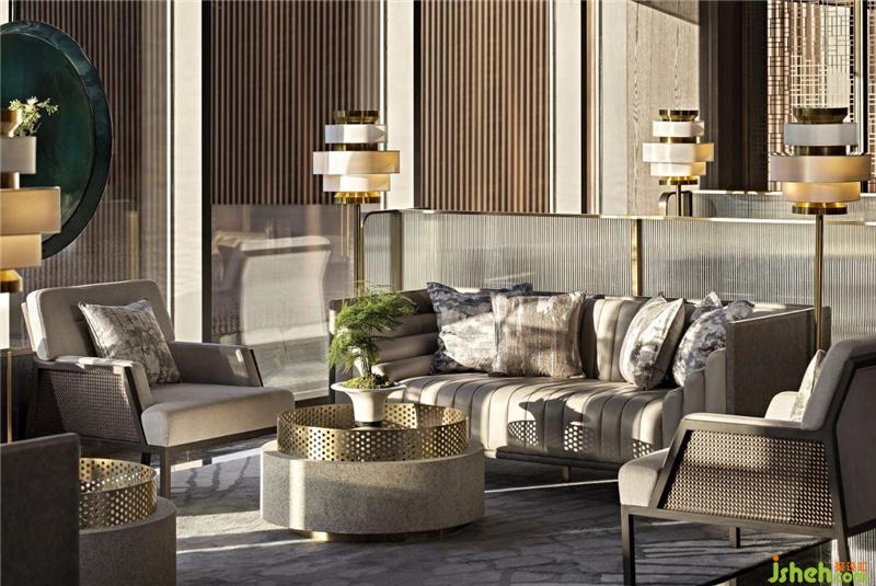 主要材料:大理石、木饰面、布艺硬包、拉丝不锈钢