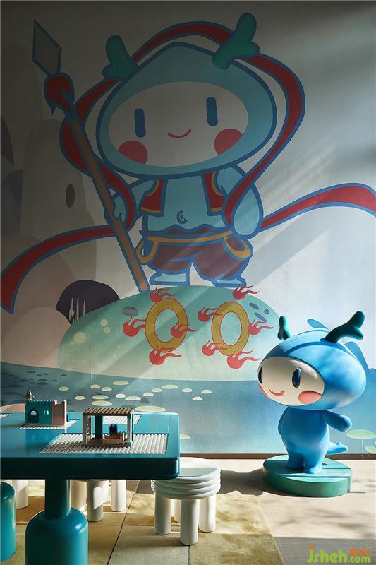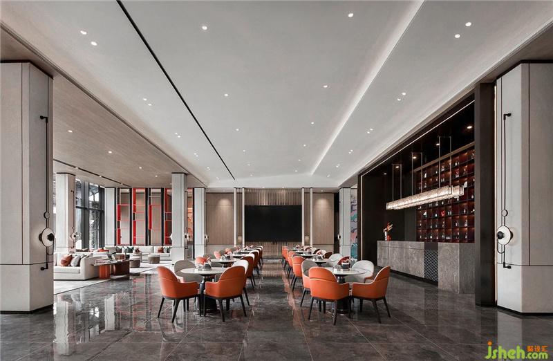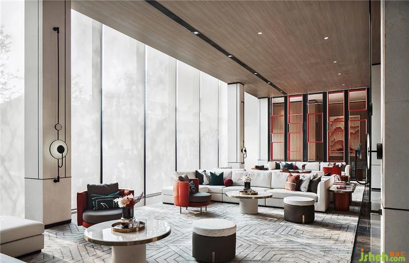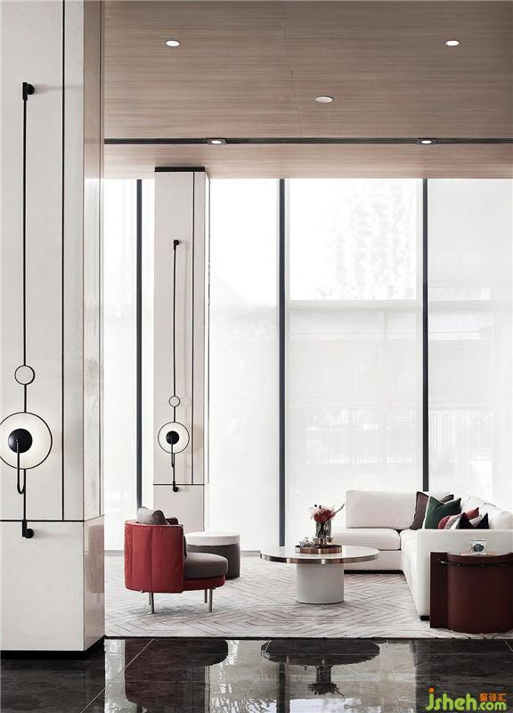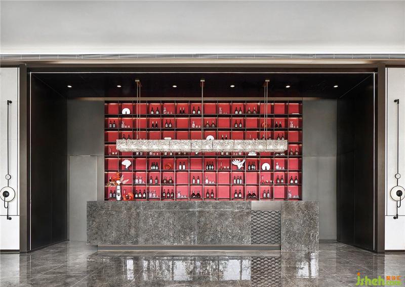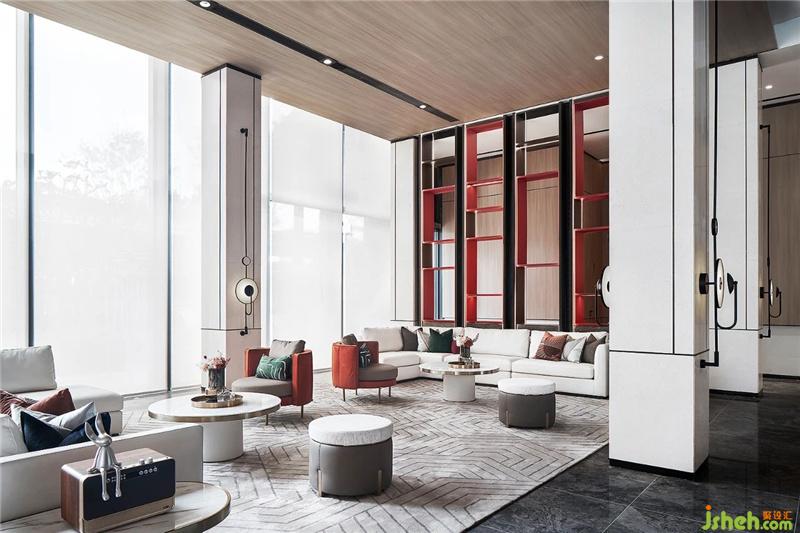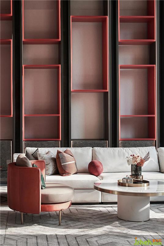 水吧台背景墙以红色呼应空间颜色,建筑瓦砾细节藏于吧台间。营销中心设计将水元素、鱼灯和建筑特色伏线于细节中,节奏干净到位,层层递进,用空间来设计、引导风雅生活的当代回归。