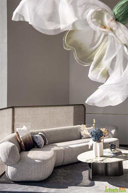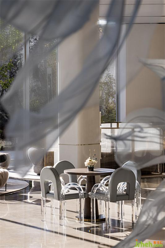 大面积的玻璃落地窗,让自然光线进入,若即若离的景色变化以及戏剧性的情感体验,激发访者的想象情境;在树影点光的映射下,置身于弧形洽谈区之中,仿如被空间包裹着。营销中心设计在弱化空间界限性的同时,希望访者凭借内心的回忆为空间添上颜色。