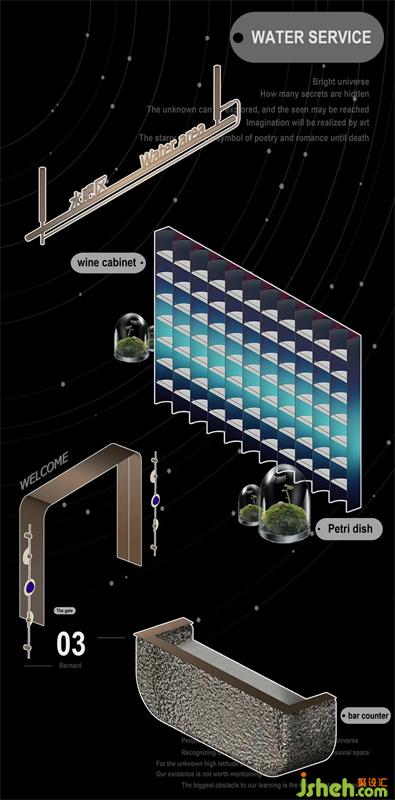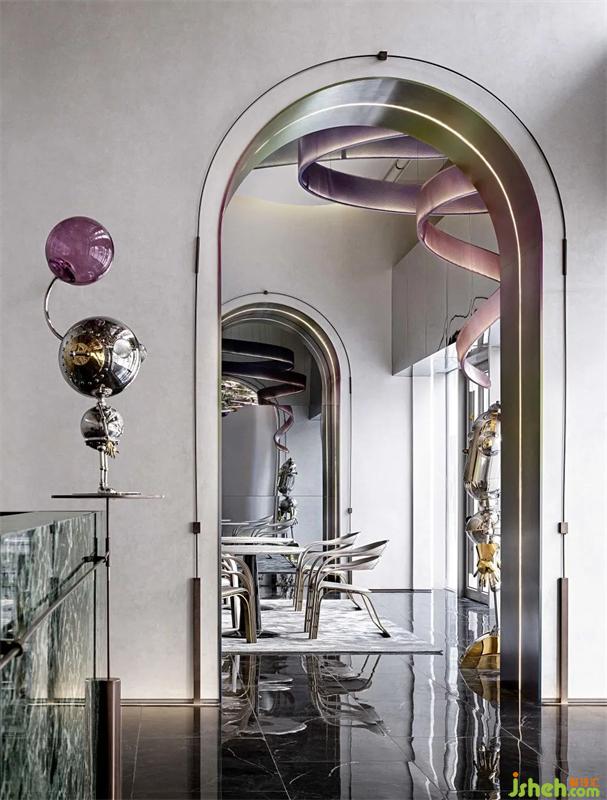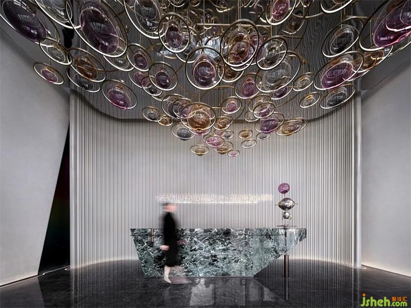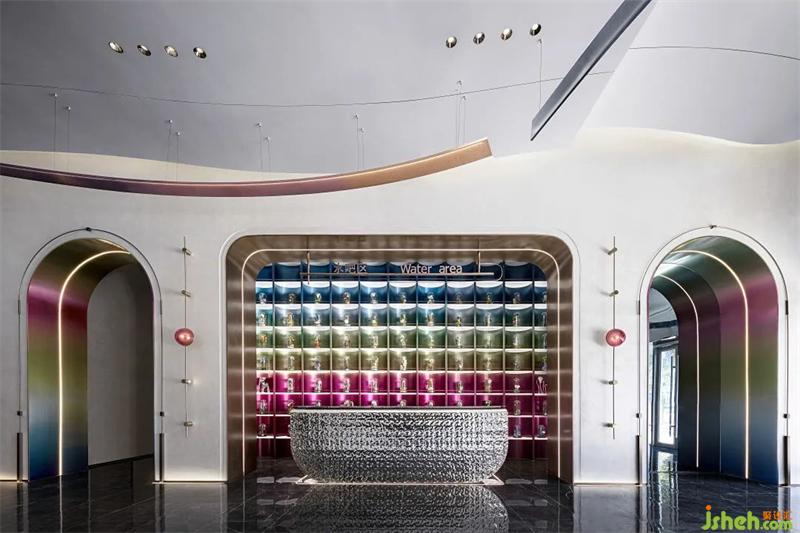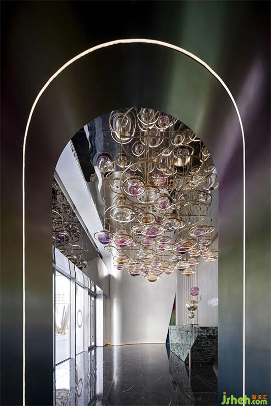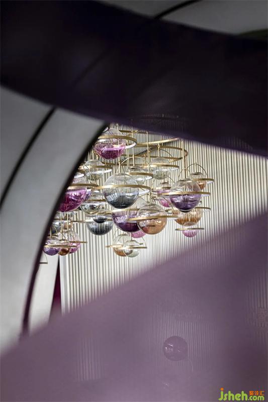 一方面在美学基础上进行体验对象的再塑造,另一方面以璀璨宇宙星辰的提炼,变幻而又纯粹,延伸到空间设计中的吊饰的视觉语言。空间中融入氛围的艺术装置是设计中加法的呈现,来自未来科技的金属机器人将朦胧奇幻的空间置入现实,赋予空间灵动的活力,让空间的趣味性和探索性恰到好处。