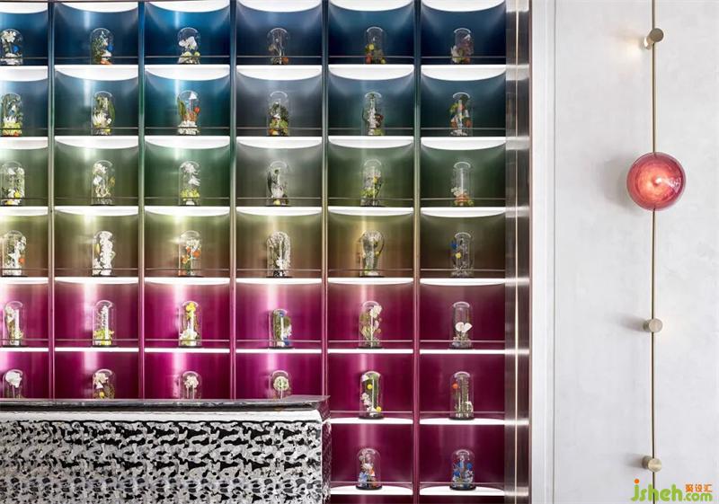 水吧区墙面艺术的泡泡花艺装置,在蓝、红色彩的基础上与空间中多彩的不锈钢保持统一的色系呼应,售楼处设计犹如星际里的太空实验装置,感知探索生命与科技空间,在视觉艺术上与空间故事共鸣。