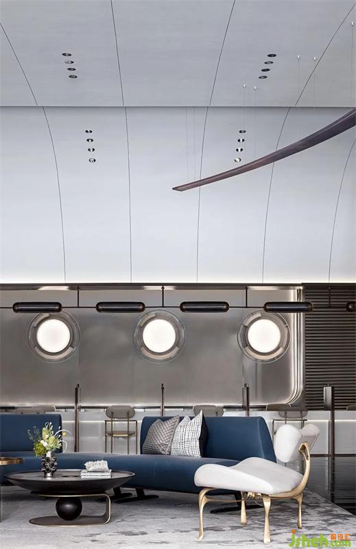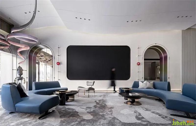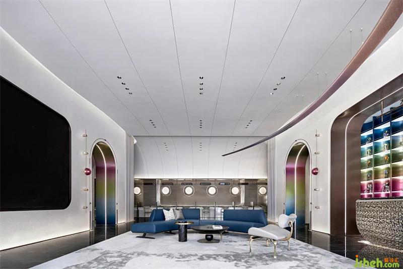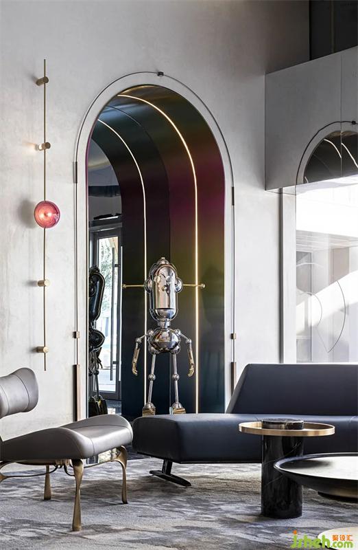 在洽谈区,角落的机器人头顶上抽展出一条漫漫的金属彩带拓展视觉延续性,售楼处设计营造张力的动态感空间,虹彩矿物之美与现代建筑在非叙事系列中相互发现;见证了光的旅程,整个空间在硬装动感的线条衬托下,给人自由的时空感。