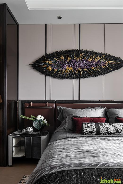 浅米色的背景墙与深棕色的皮革床靠搭配,样板房设计散发出成熟的韵味,凝练的软装组合勾勒了主卧的雅奢质感。