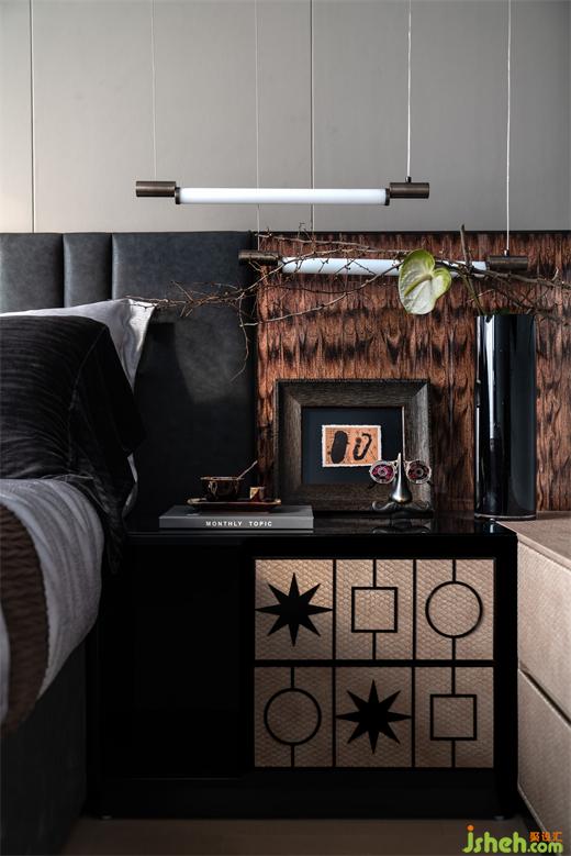 餐厅吊灯形似灵蛇图腾,以迷人的姿态象征永生,样板房设计呈现独有的蔓延弯曲,诱惑且感性。具有意式风情的皮革色彩和纹路质感,每一个用材和细节都诠释了尊贵和独享。