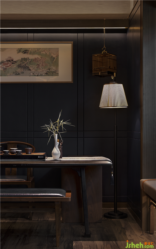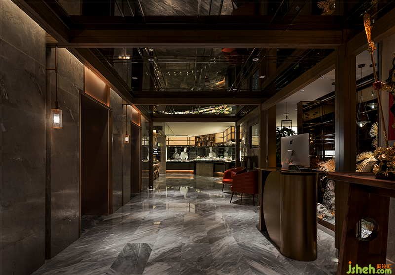 公共区域设计的“艺术装置廊”,将砂石干景与苍松、竹林联系起来,变体的木构装饰柱与镜面的天花板结合,从视觉上延伸了空间的进深感,扩展了空间界面。