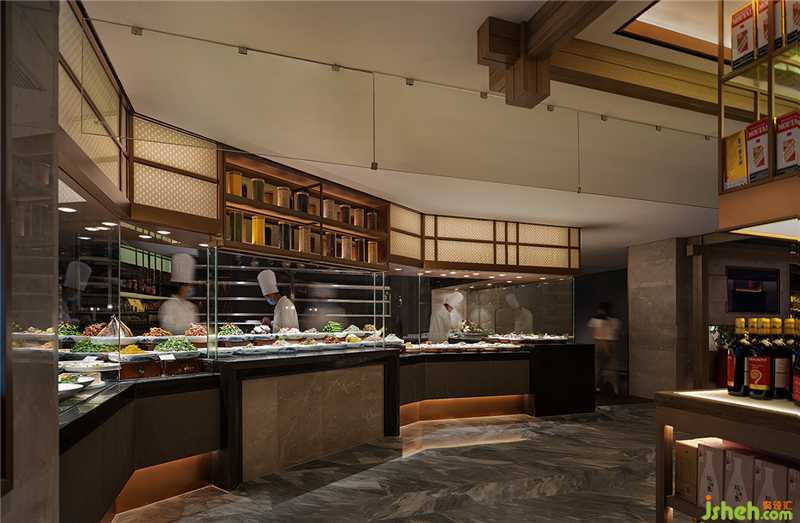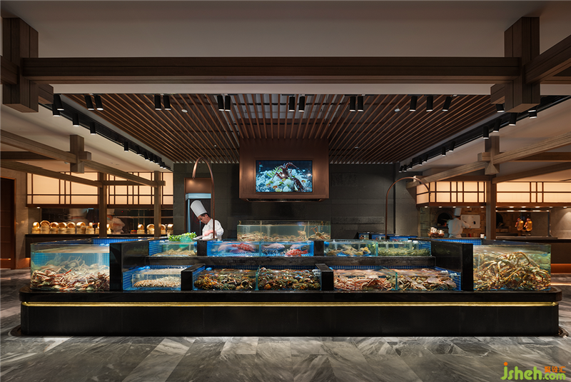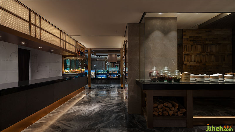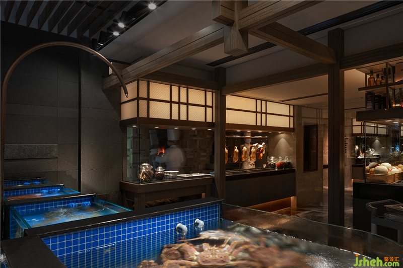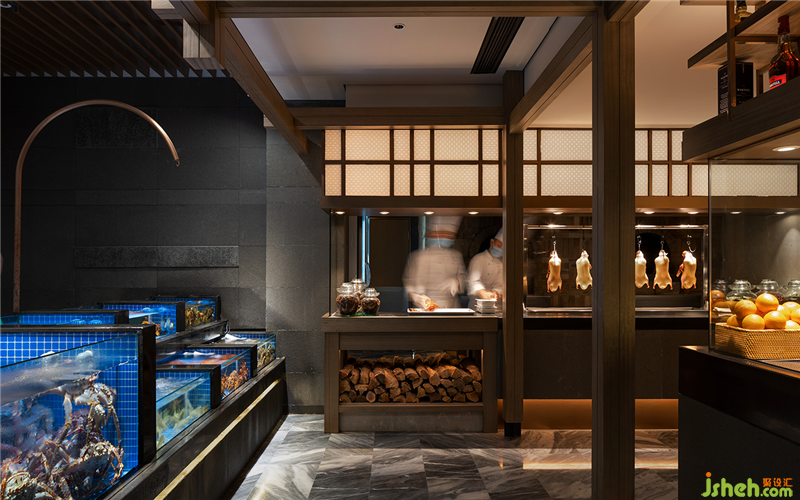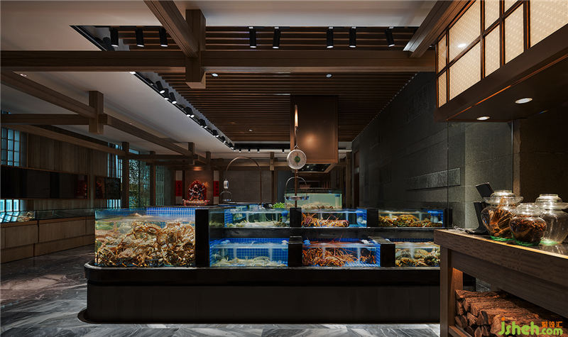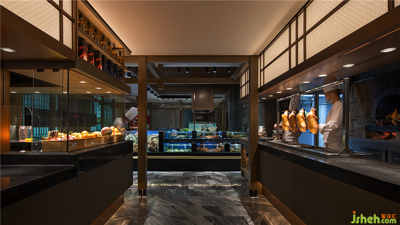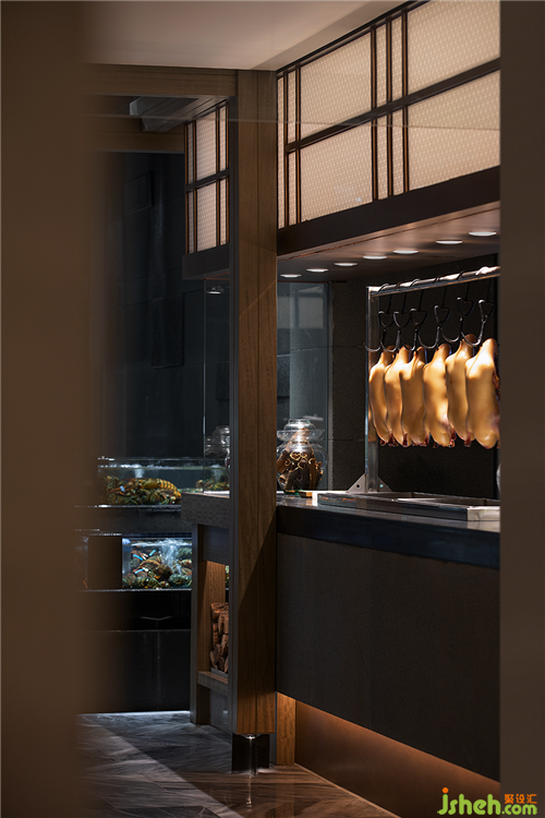 餐厅设计类似江南园林的回廊结构被运用到空间中,园林中走马廊所围绕的中庭和庭院被海鲜明档和宴会厅替代,两者一小一大。
