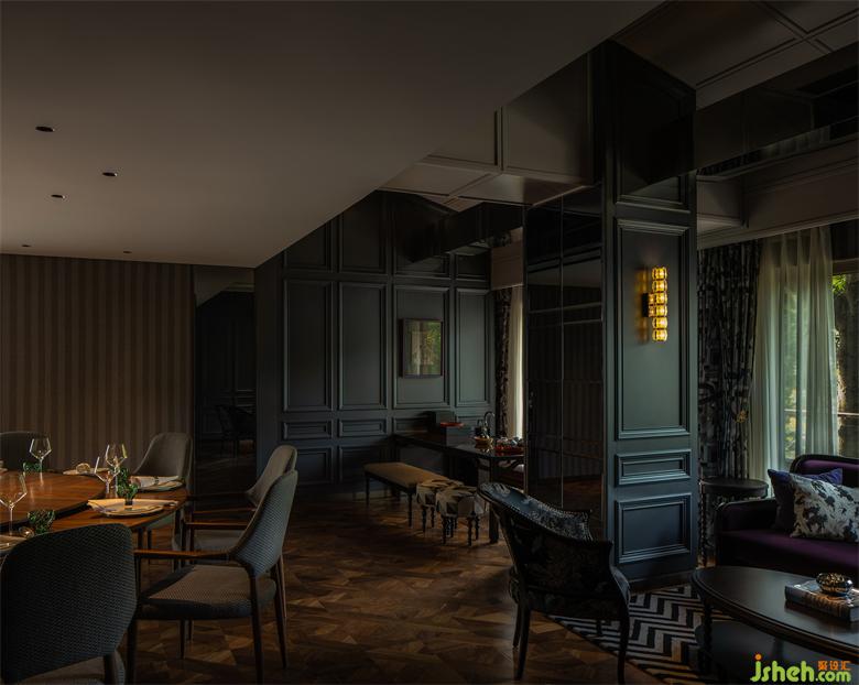 纵横的梁柱结构裸露,辅以异色木材覆盖,餐厅设计用餐区顶部被阁楼自然压低,镜面消解了屋面与立柱体量的同时,反射餐桌与户外的光景。